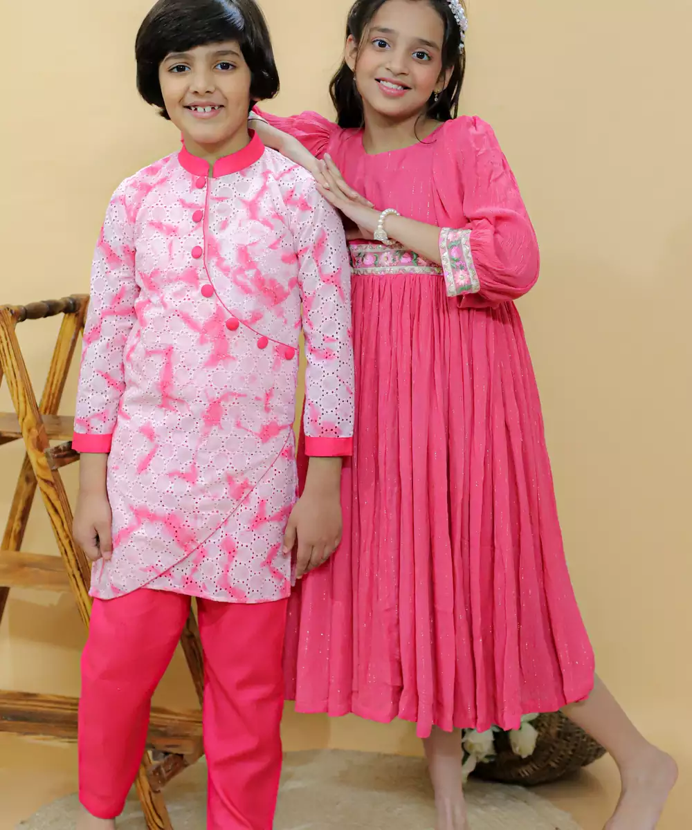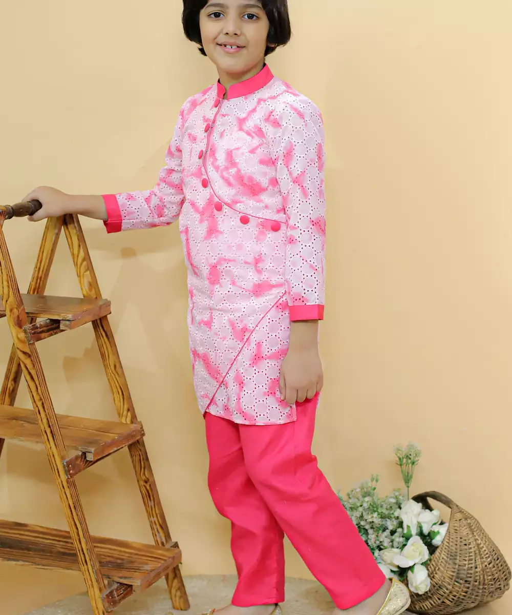 Introducing Our Nebula Kurta Set, A Delightful Ensemble For Your Little One. This Charming Set Includes A Premium Cotton Hakoba Tie And Dye Kurta In A Classic Pink Hue, Featuring An Asymmetrical Pattern Exuding Elegance Fit For Royalty. Finely Crafted Handmade Fabric Buttons Add A Touch Of Sophistication.
