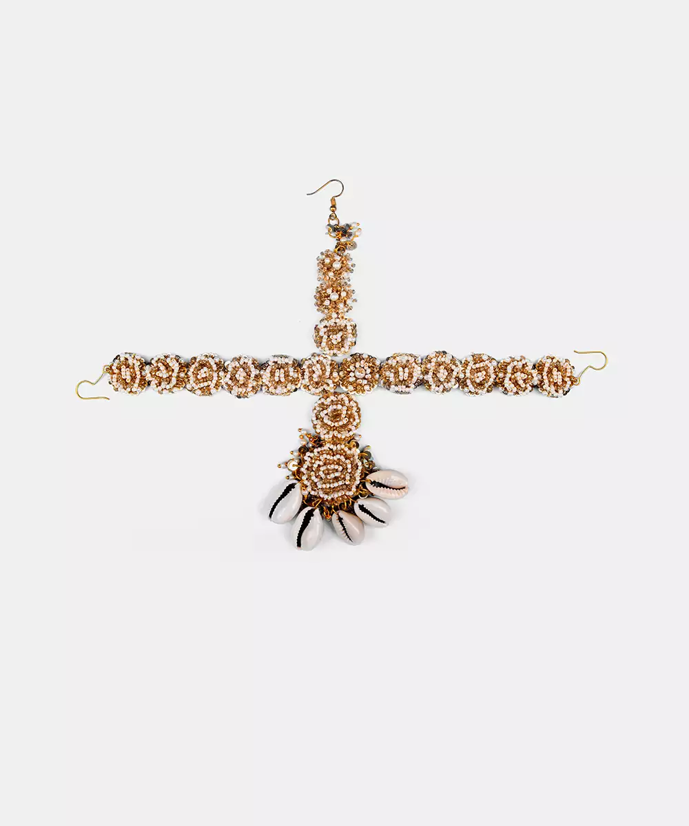 Featuring A Gold & White Finish Mathapatti Studded With Pearls ,Shells,Chid In Set.