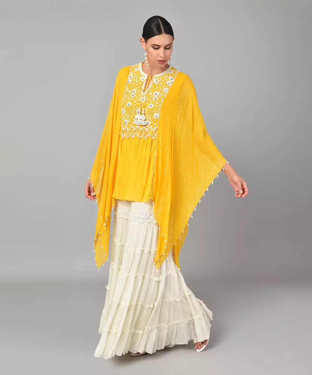 Ivory Bead Sequins Heavy Embroidered Yoke Mustard Georgette Tunic With An Embroidered Band Tier Georgette Palazzo.