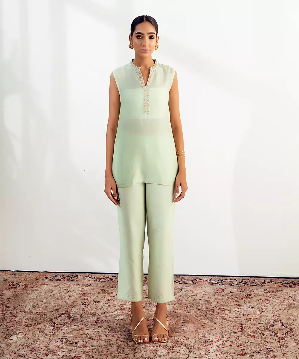 Featuring A Mint Green Tunic In Silk Chanderi Base With Resham, Sequins, And Pearl Embroidery. It Is Paired With Matching Pants.