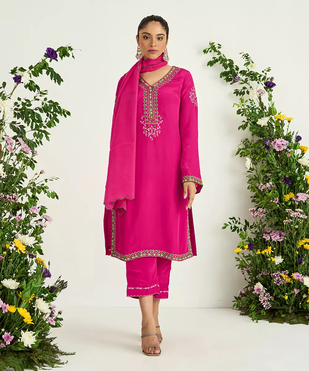 Featuring A Rani Pink Kurta In Crepe Base With Resham Embroidery, Sequins And Pearl Embellishments. It Is Paired With Matching Pants And An Organza Dupatta.