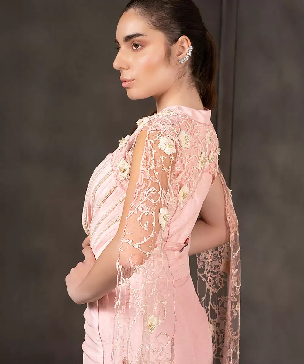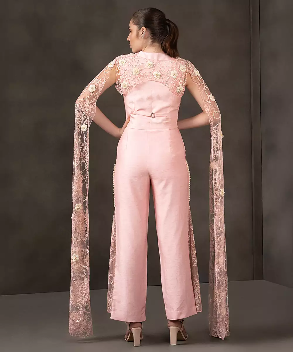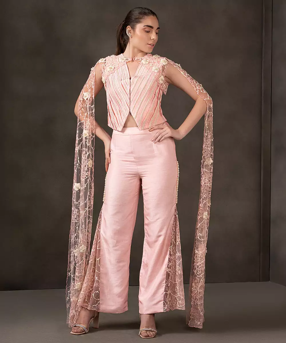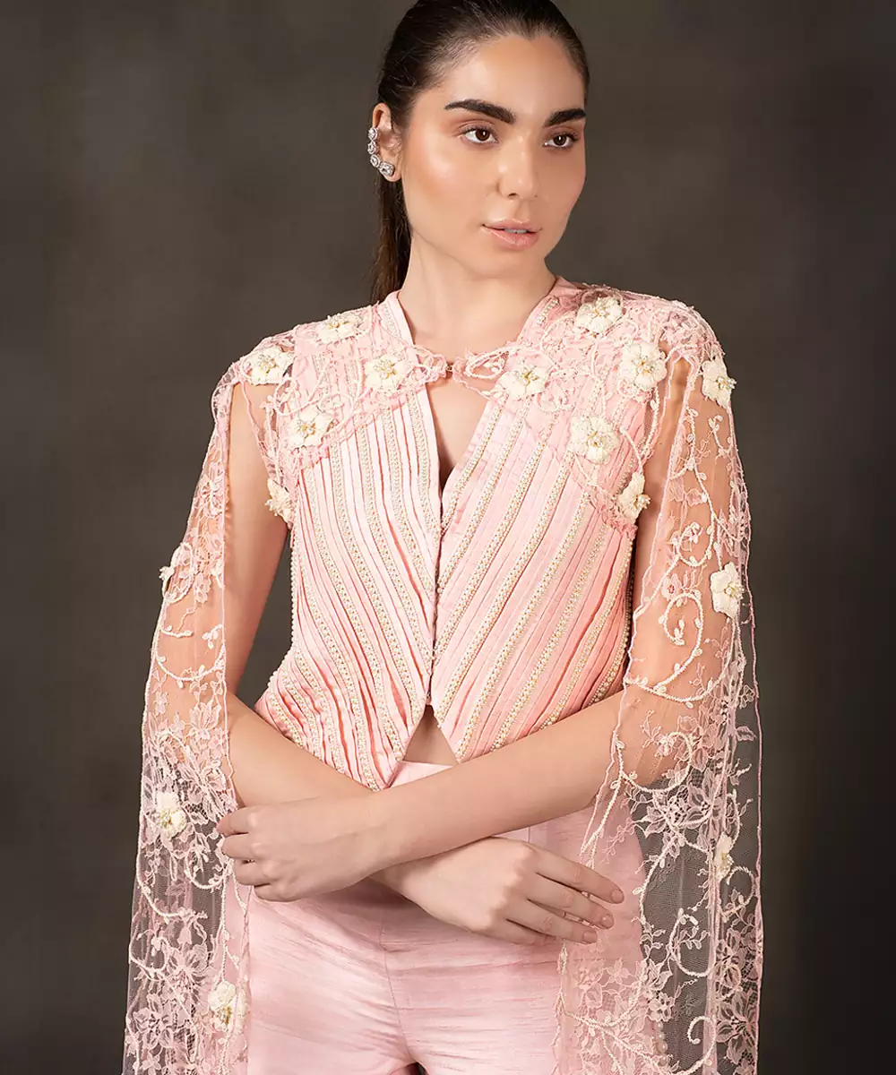 This Pastel Pink Co Ord Set Features Tailored Straight Pants With Lace Detailing At The Bottom Paired With A Sleeveless Jacket Style Blouse In Striped Detailing. The Blouse Is Accentuated With Delicate Pearl Edging And Soft Floral Embroidery On The Shoulders. A Sheer Embroidered Cape With Lace Fabric And Intricate Pearl Detailing Adds A Graceful Layered Effect.