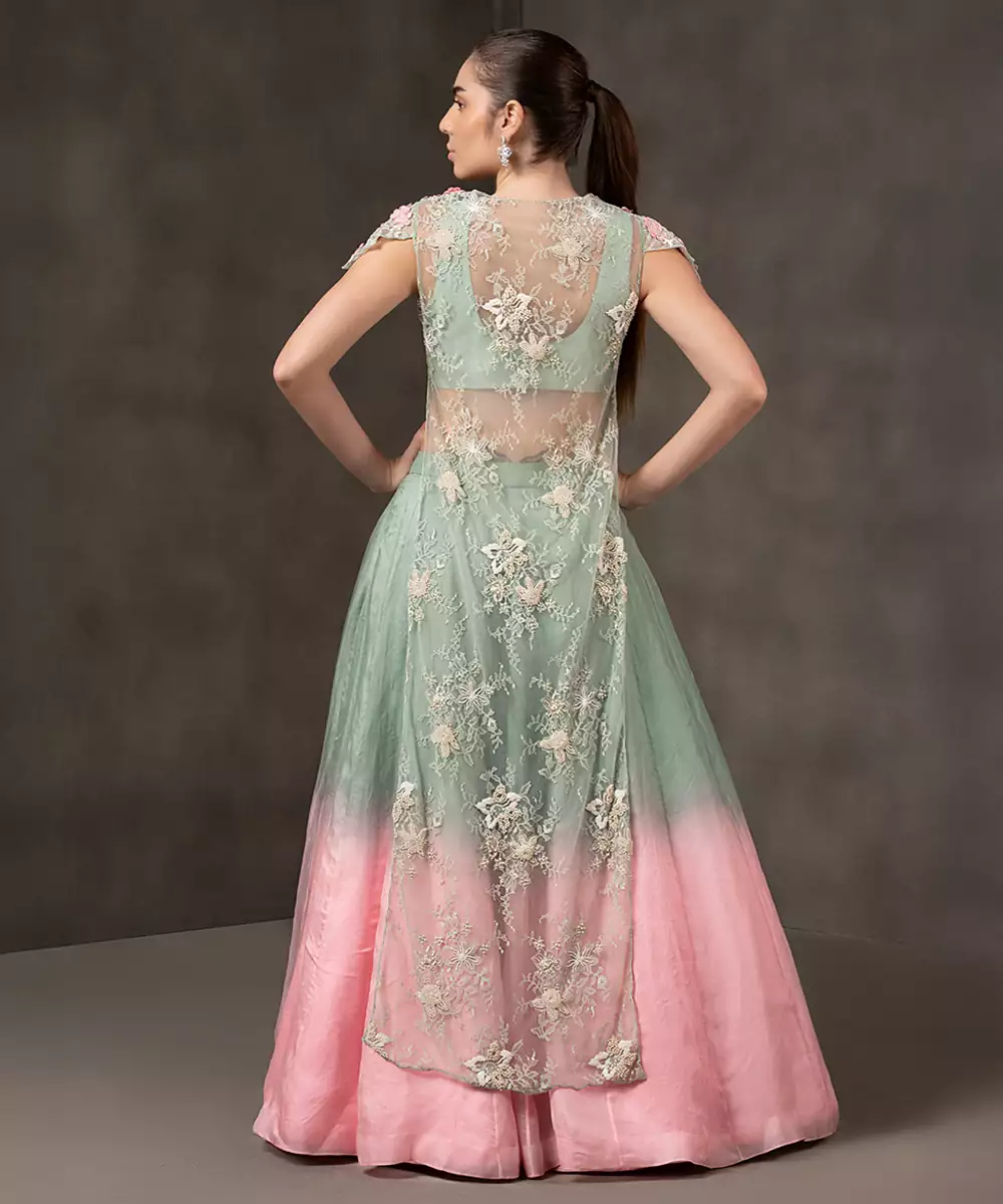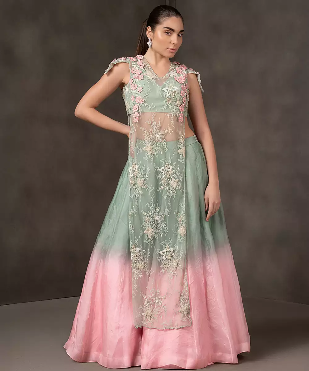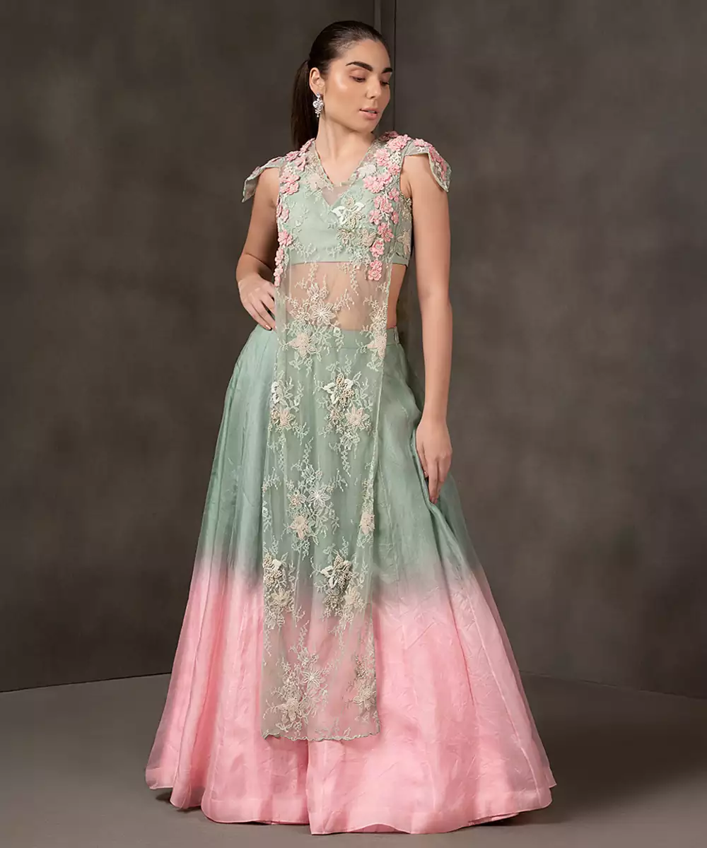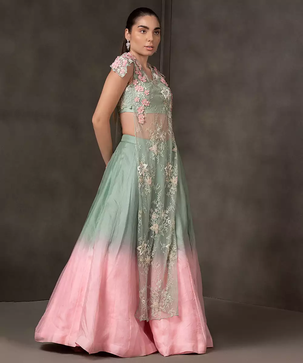 This Elegant Pastel Lehenga Features A Soft Ombré Effect Blending Mint Green Into Blush Pink For A Graceful Flow. The Blouse And Sheer Overlay Are Beautifully Detailed With Lace Fabric, Floral Embroidery, And 3 D Flower Appliqués.