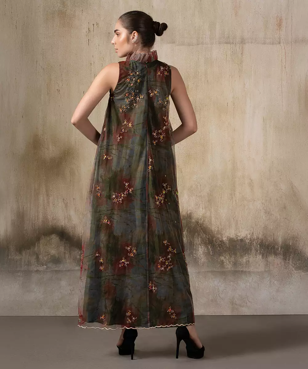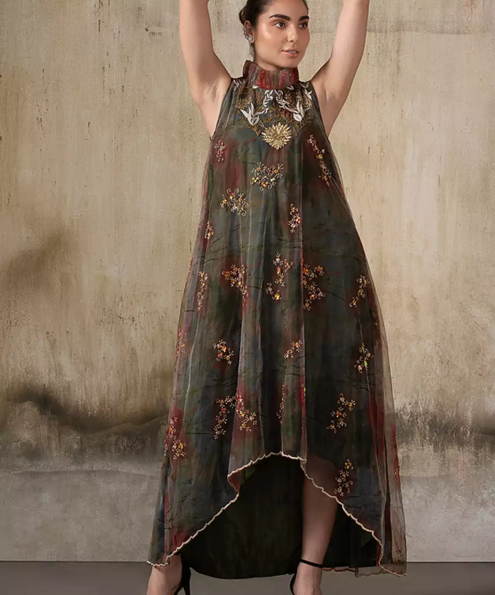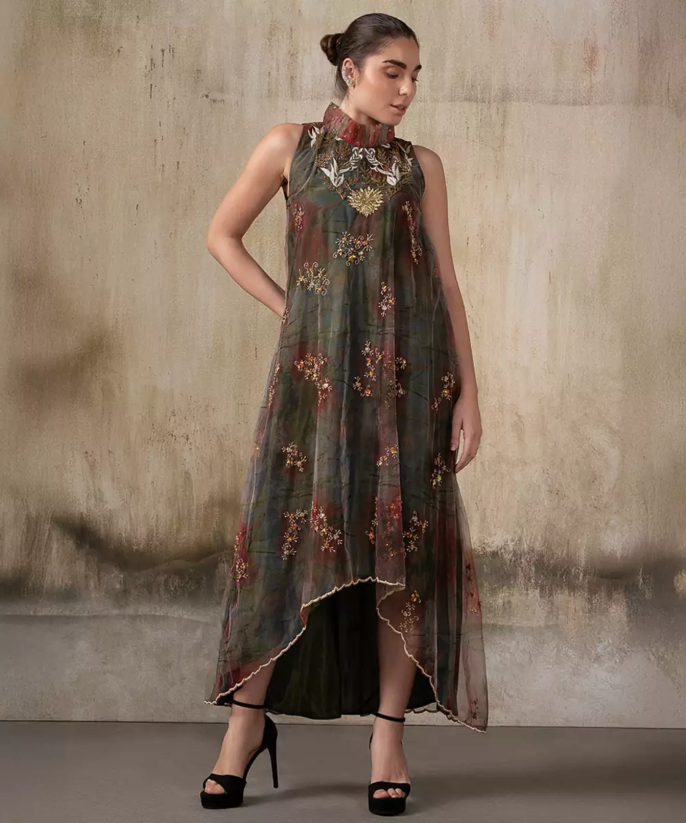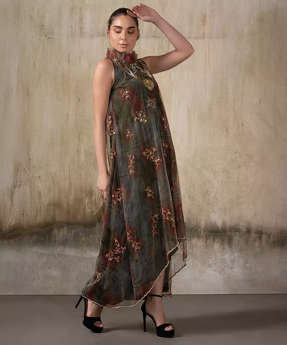 This Olive Green Asymmetrical Dress Is Crafted In Sheer Fabric With A Soft Flowy Fall. It Features Delicate Floral Sequin Embroidery In Gold And Rust Tones, Adding Sparkle To Its Earthy Base. The High Ruffled Neckline And Sleeveless Cut Bring A Refined Charm, While The Layered Hemline Enhances Movement And Elegance.