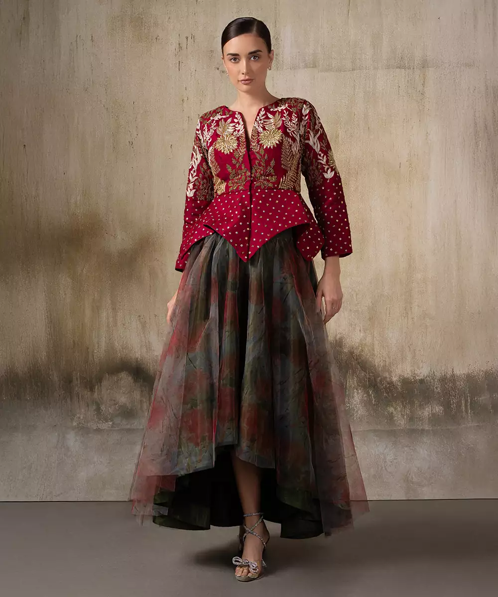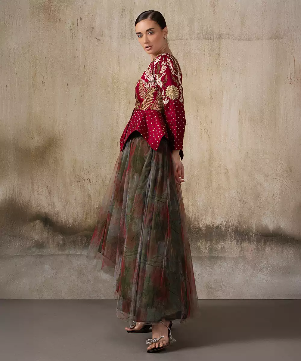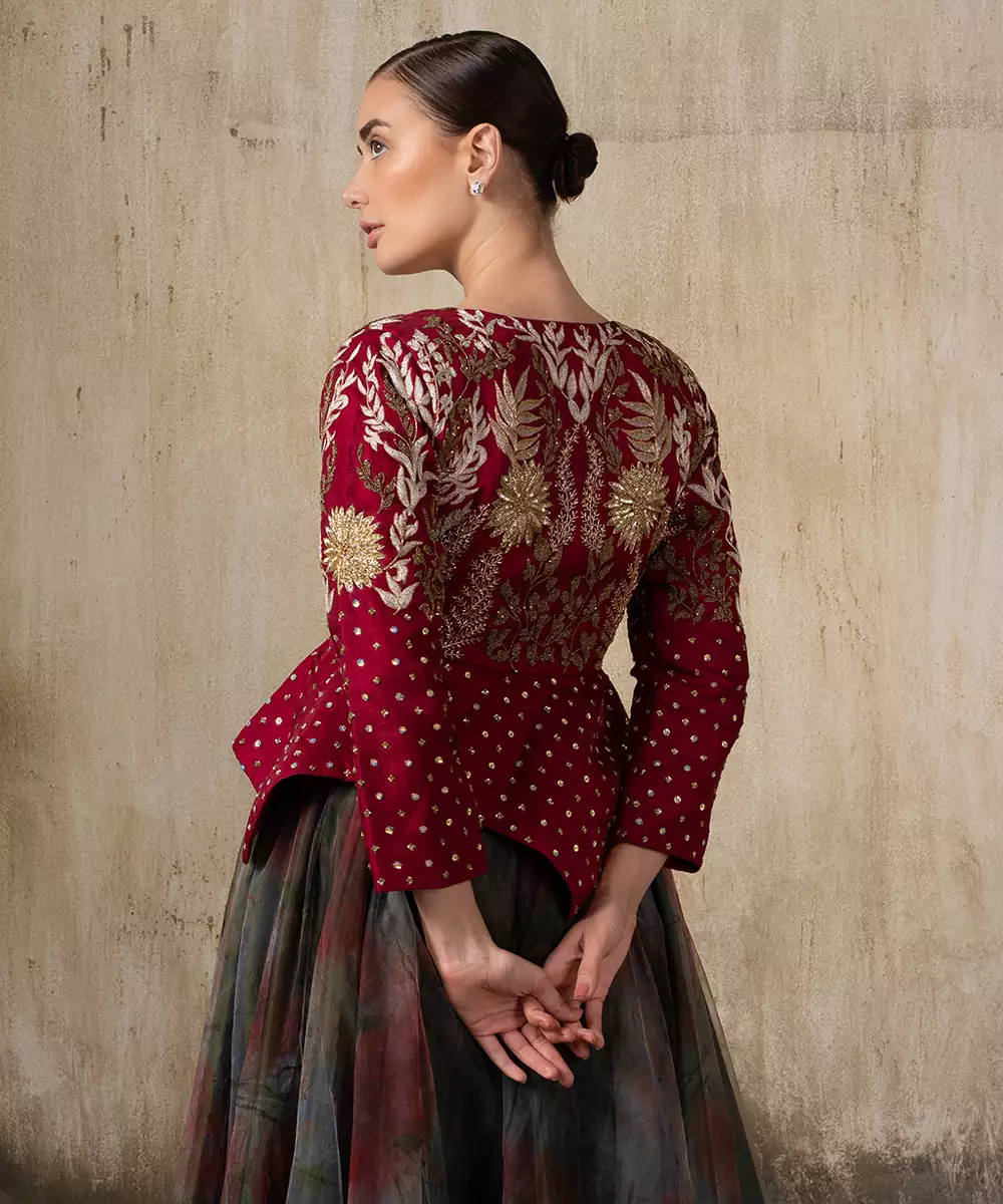This Elegant Ensemble Features A Wine Red Peplum Jacket Richly Adorned With Golden Thread Embroidery, Floral Motifs, And Delicate Sequin Highlights. The Structured Jacket Is Balanced With A Flared Tulle Skirt In Muted Watercolor Style Prints, Adding Depth And Fluidity. The Sheer Overlay Creates A Dreamy Layered Effect, While The Fitted Bodice Enhances Sophistication.