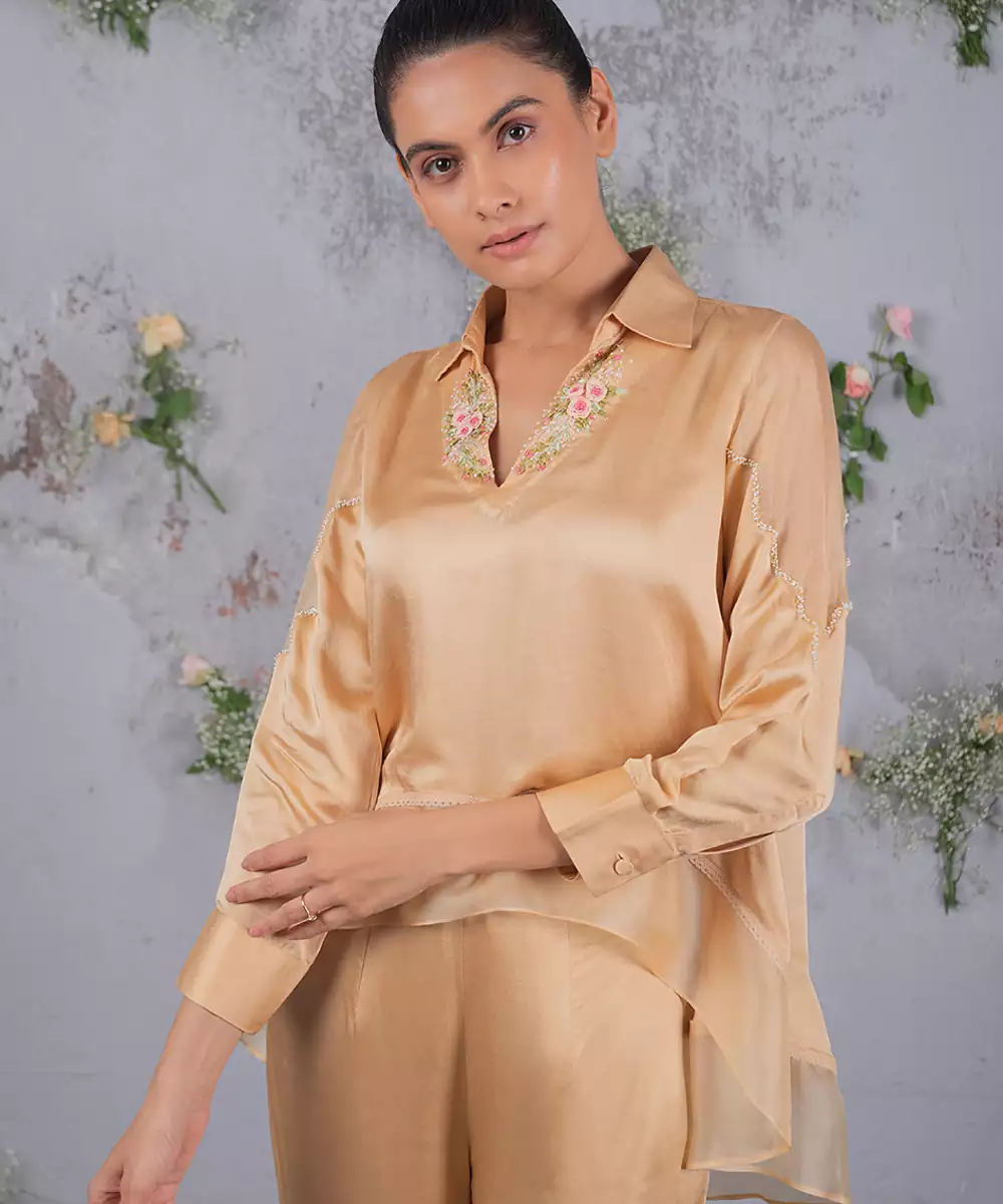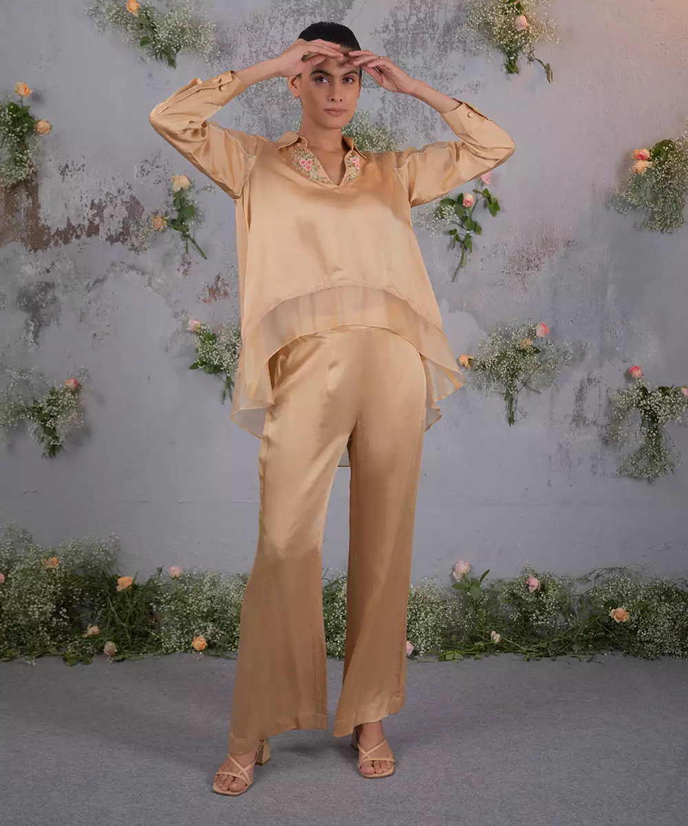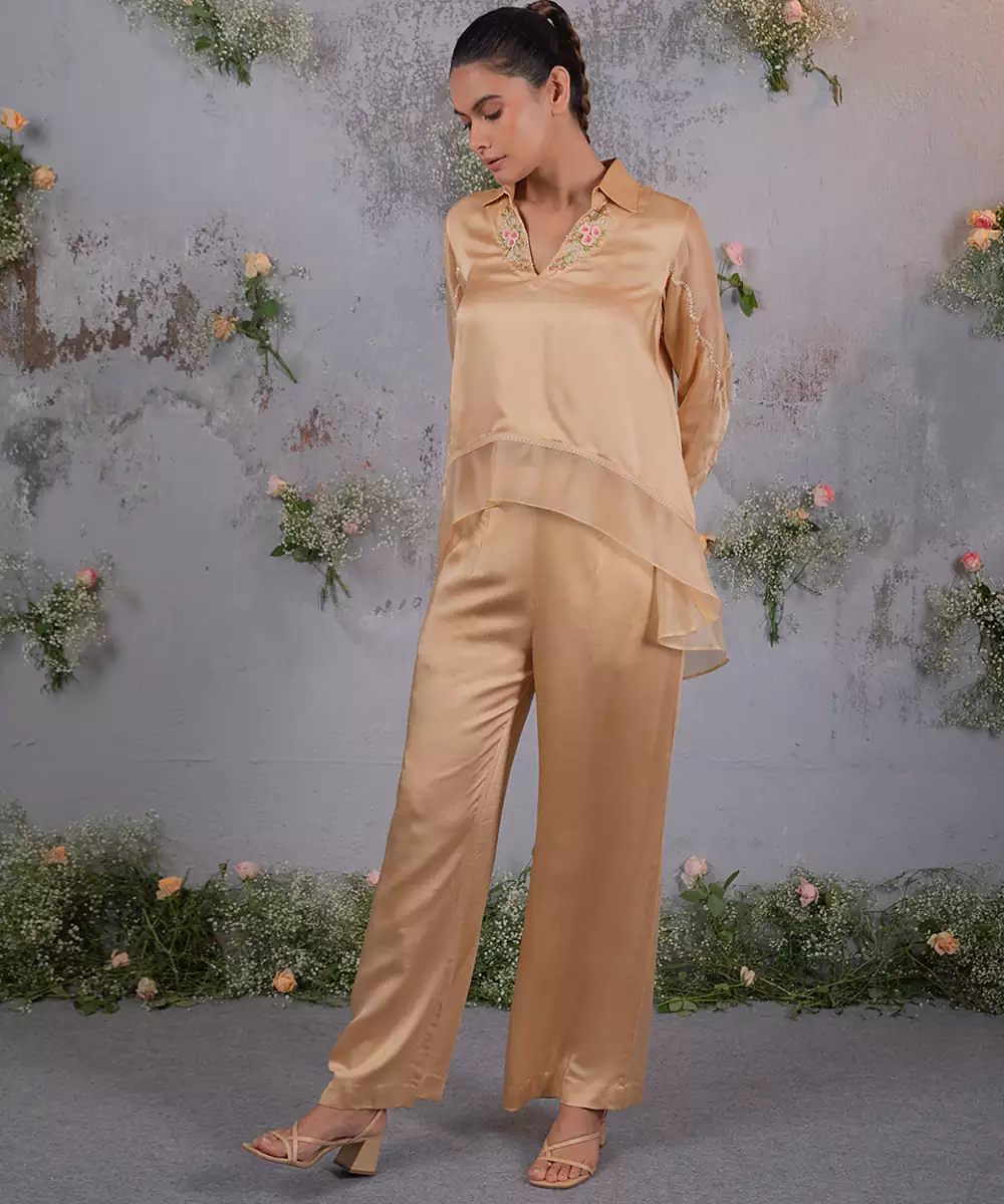 This Gold Satin Co Ord Set Exudes Effortless Elegance And Contemporary Glamour. Crafted From Lustrous Satin Fabric, It Offers A Smooth, Refined Finish With A Graceful Drape. Perfect For Festive Occasions And Evening Celebrations, It Delivers A Chic, Sophisticated Look With Timeless Appeal.