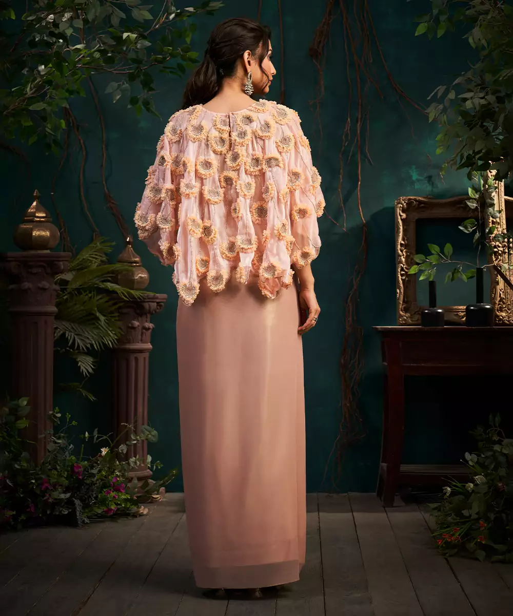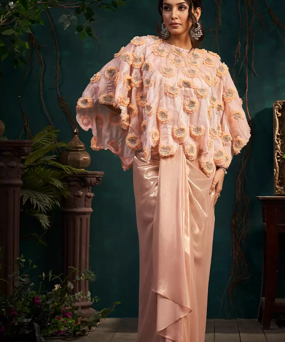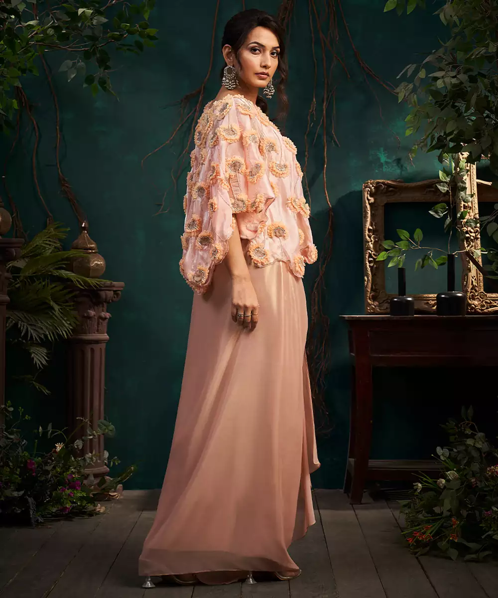 This Pink Embroidered Organza Co Ord Set With Cape Exudes Graceful Elegance And Modern Charm. Crafted From Lightweight Organza, It Features Delicate Embroidery That Enhances Its Refined Appeal. The Coordinated Silhouette Paired With A Flowing Cape Creates A Statement Look, Perfect For Festive Occasions, Weddings, Or Special Celebrations.