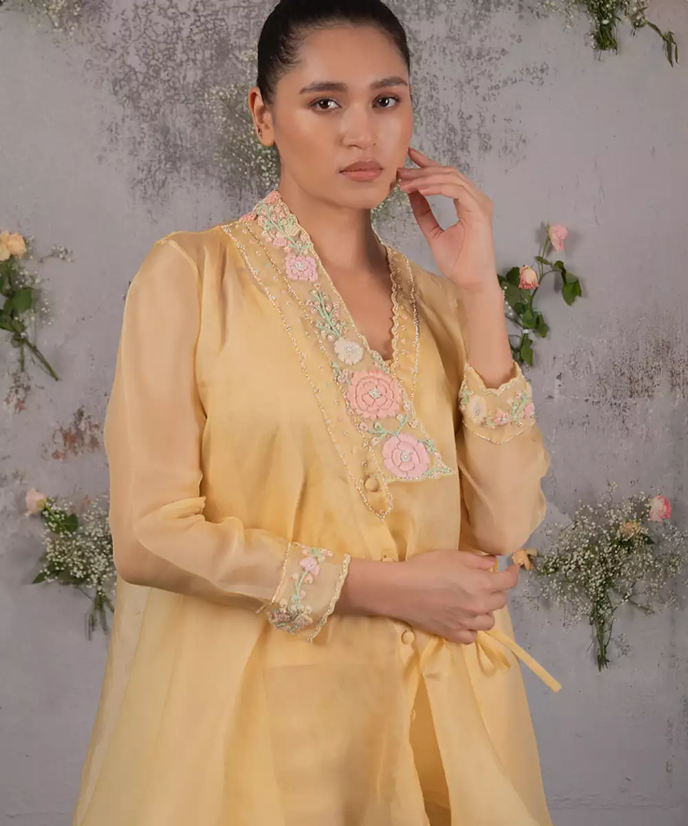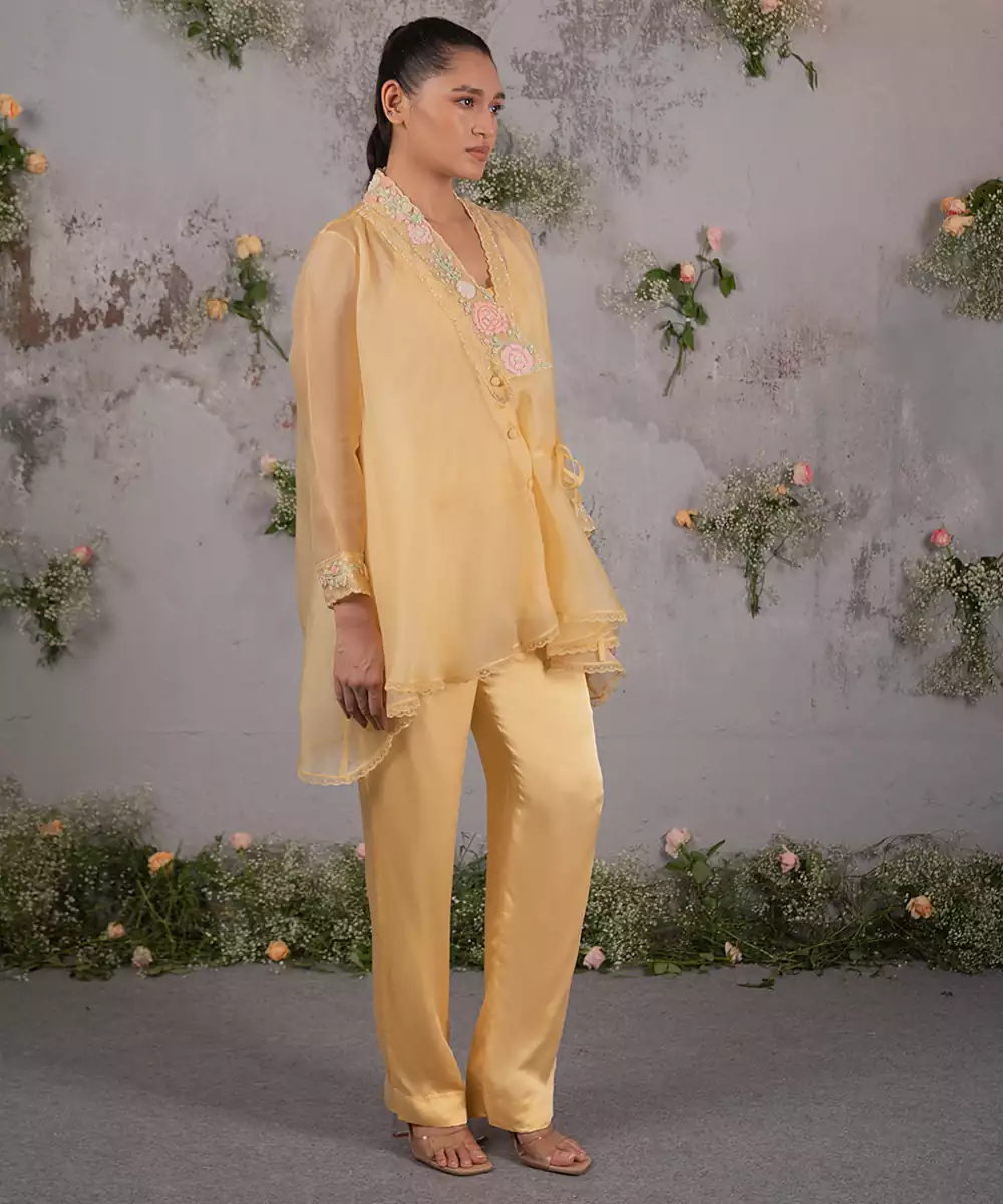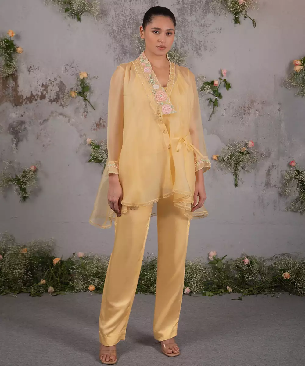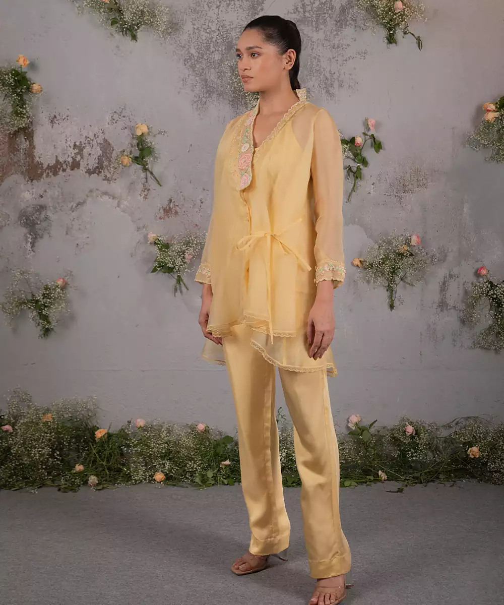 This Yellow Embroidered Satin Co Ord Set Exudes Understated Elegance And Modern Charm. Crafted From Lustrous Satin Fabric, It Features Intricate Embroidery That Adds A Refined Touch. Perfect For Festive Occasions And Celebrations, It Offers Graceful Style, Comfort, And Timeless Sophistication.