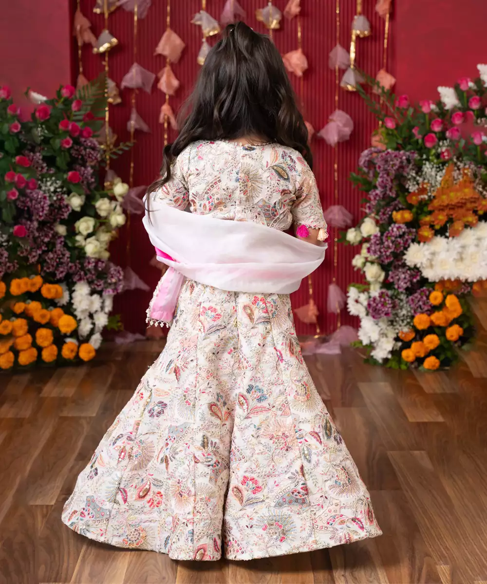 A Voluminous Flared Lehenga Adorned With Intricate Paisley And Floral Motifs In Soft Pastel Hues.