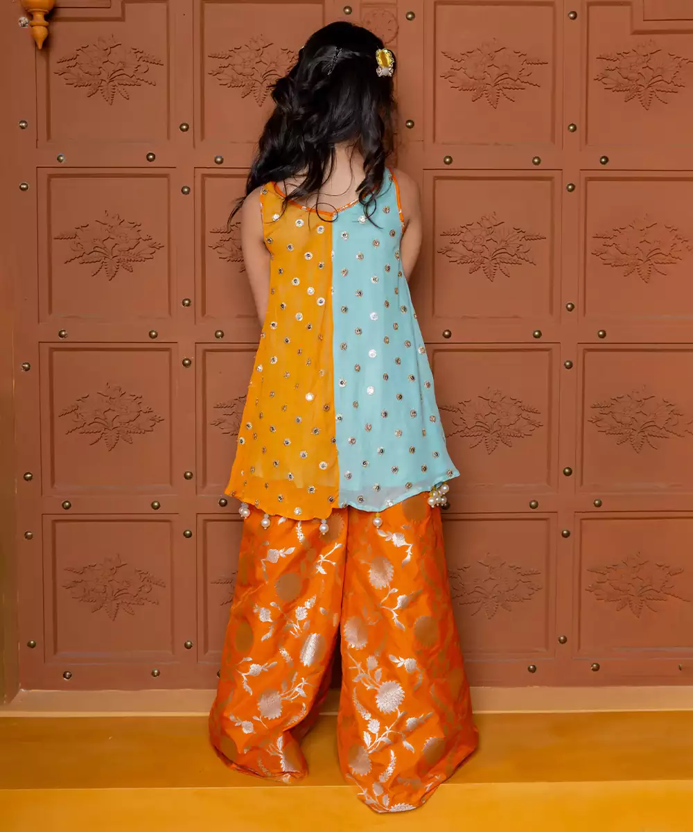 A Rich And Festive Ensemble, This Silk Kurta Set Is Beautifully Contrasted With Vibrant Blue And Orange Embroidery. The Luxurious Sheen And Smooth Drape Of The Silk Fabric Provide An Elegant Foundation, While The Colorful Embroidery Adds A Stunning, Traditional, And Energetic Touch. This Is A Sophisticated And Eye Catching Choice For Any Celebration.