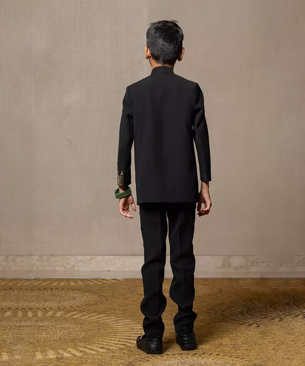 Elegant Blackbandhgala With Gold Embroidery, Paired With Matching Tailored Pants For A Sophisticated Look Colour: Black Fabric: Armani Fabric Components : 1 Bandhgala / 1 Pant