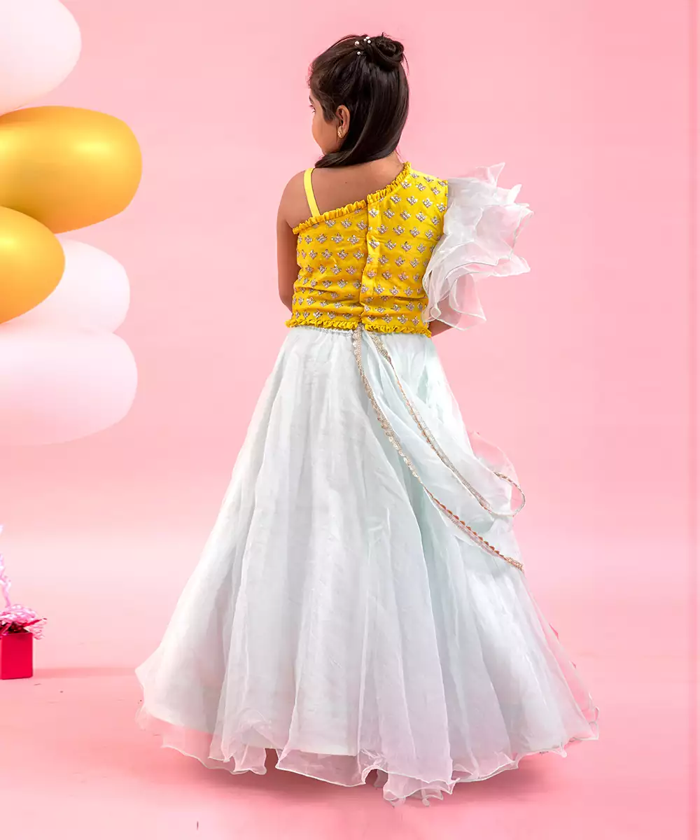 One Side Strap And Other Side Two Layered Ruffled Sleeve Embroidered Crop Top Dupatta Attached At Hem Organza Made Lahenga With Side Zip And Hooks
