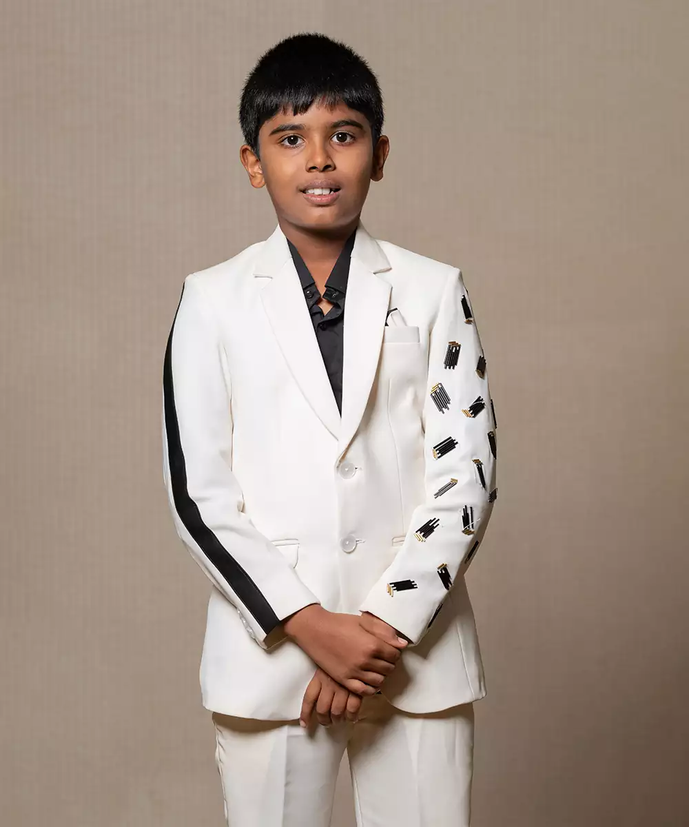Modern Off White Suit With Blackaccents And Stylish Embroidered Sleeve Detail, Paired With Trendy Sneakers For A Unique, Contemporary Look