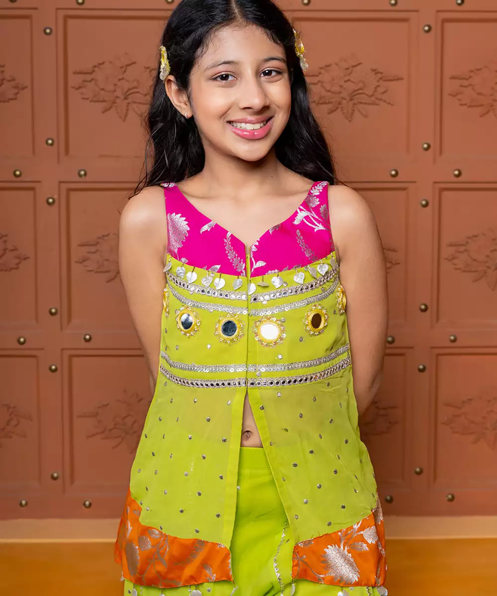 A Lively And Graceful Ensemble, This Georgette Co Ord Set Is Beautifully Enhanced With Multicolor Embroidery. The Fluid Drape Of The Georgette Fabric Creates An Airy, Voluminous Silhouette For The Sharara Pants, Ensuring Graceful Movement. The Vibrant, Multi Hued Embroidery Adds A Rich, Festive, And Eye Catching Layer Of Detail, Making This A Perfect Choice For Celebratory Events