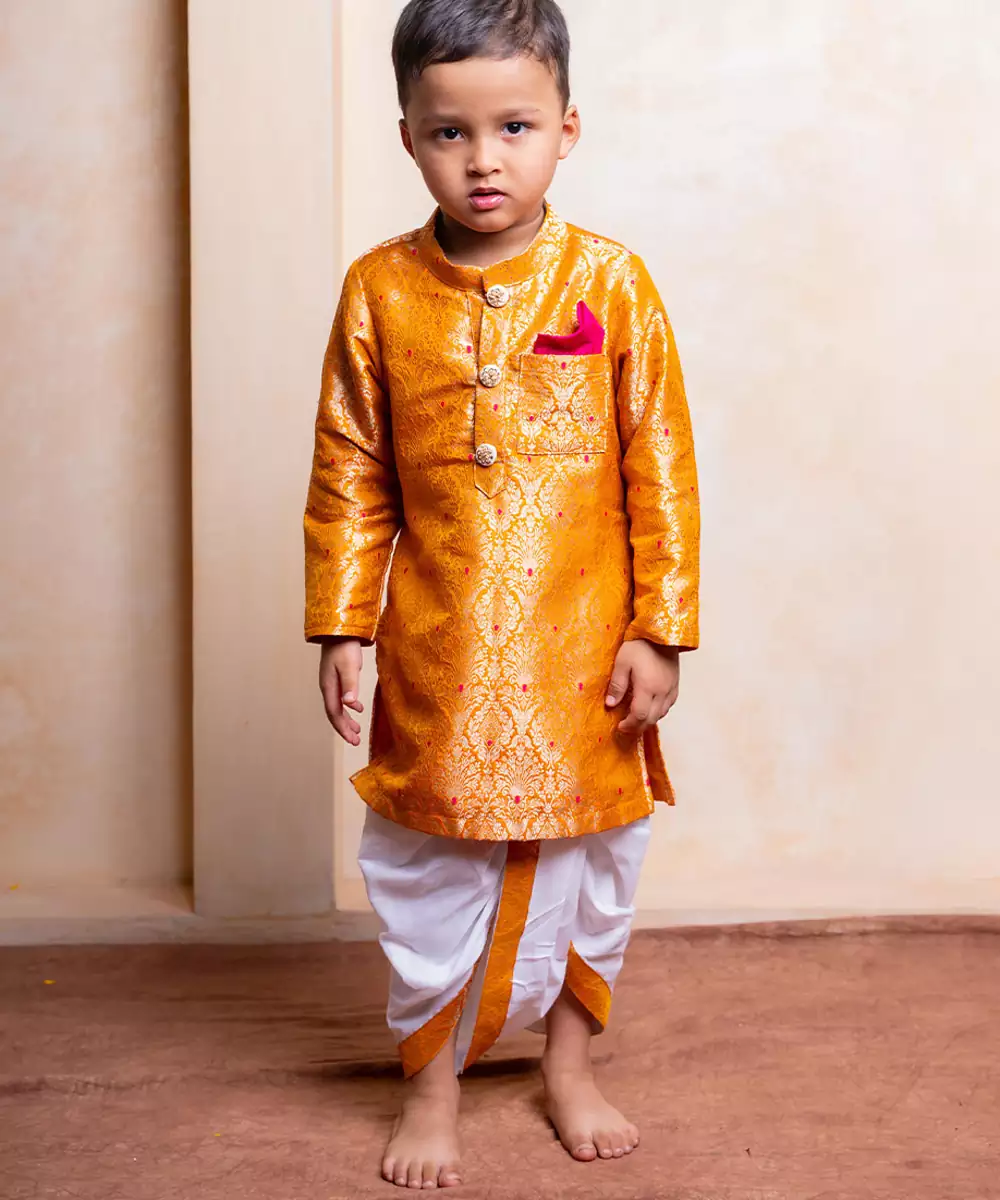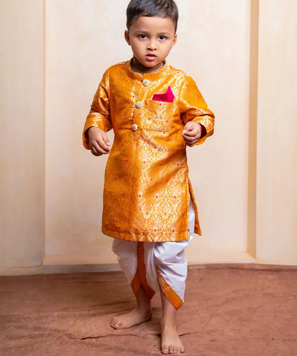 An Elegant Mustard Brocade Kurta Set Featuring Sophisticated Embroidery. The Soft, Fluid Drape Of The Brocade Fabric Ensures A Graceful Fit, Making This A Chic And Comfortable Choice For Semi Formal Events