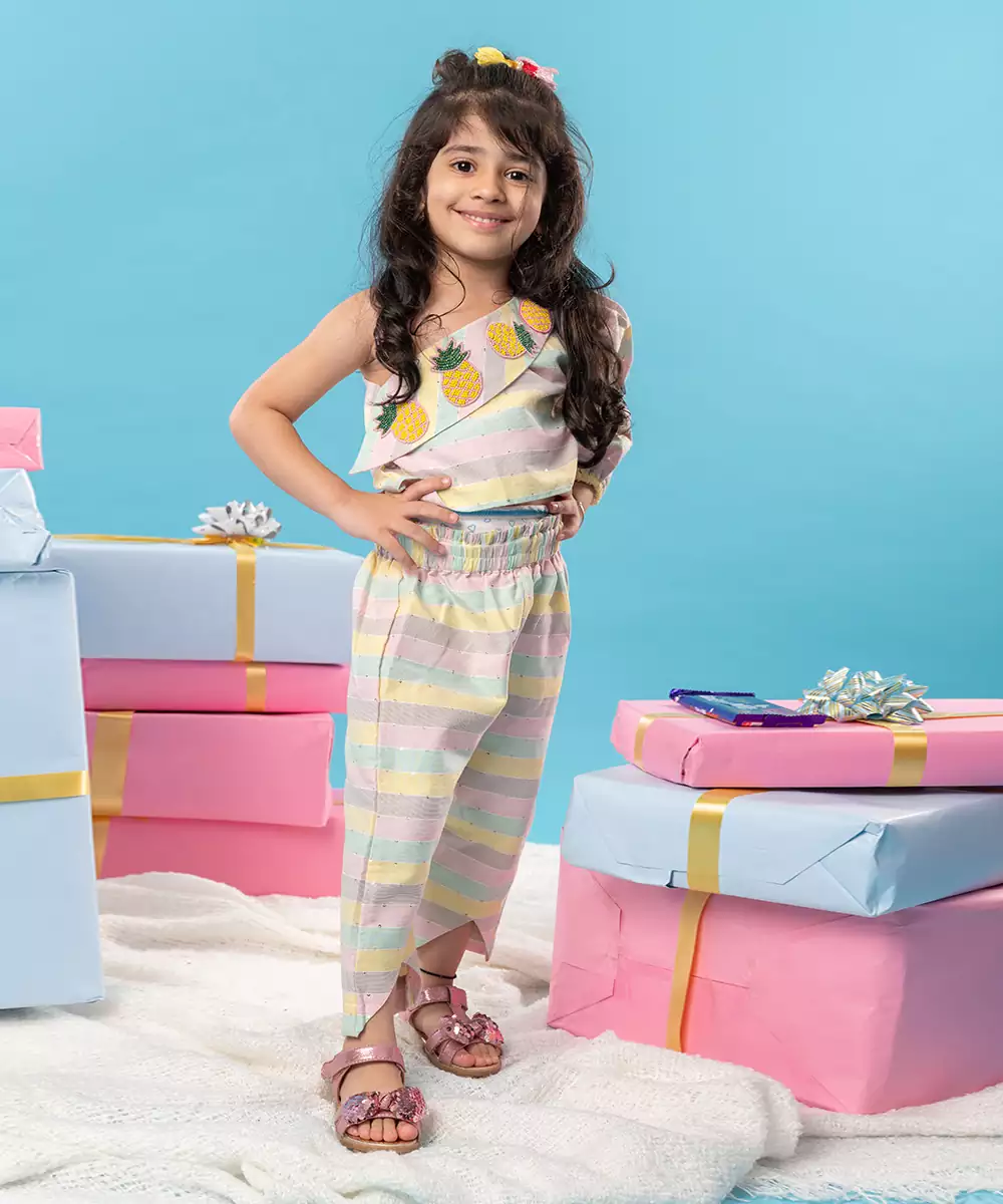 Pant Set Featuring An Off Shoulder Crop Top With Pineapple Embroidered Work On Front Side Of Top Paired With A Strip Print Pants.