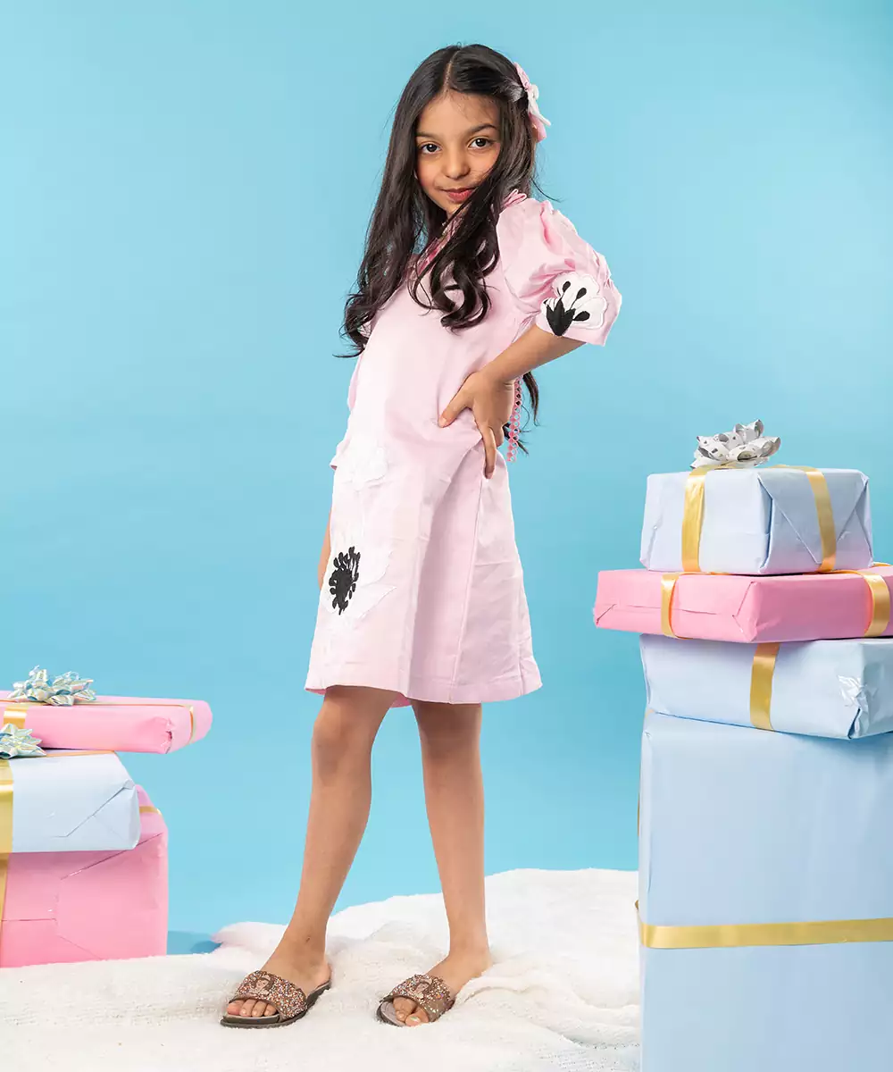 Dress Featuring A Applique Embroidered Flower On Frock , Balloon Sleeves Pattern , V Cut Pattern On Back With Lace Detailing. Colour: Pink Fabric: Cotton Silk Components: 1 (Dress) Work: Embroidered