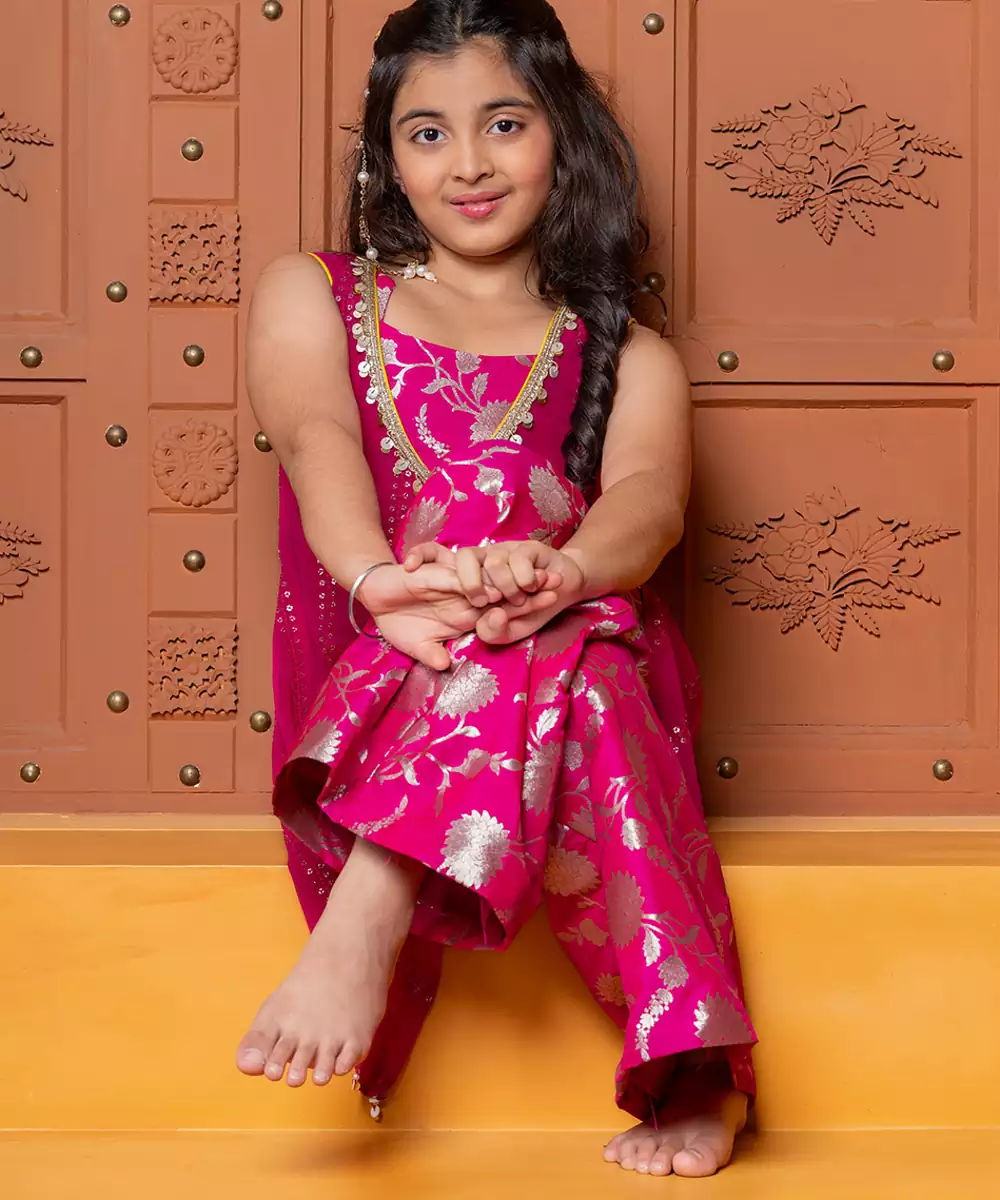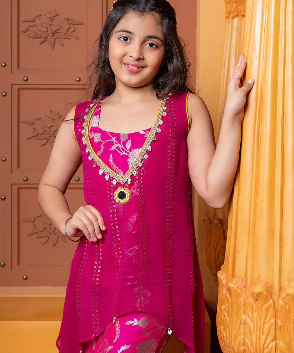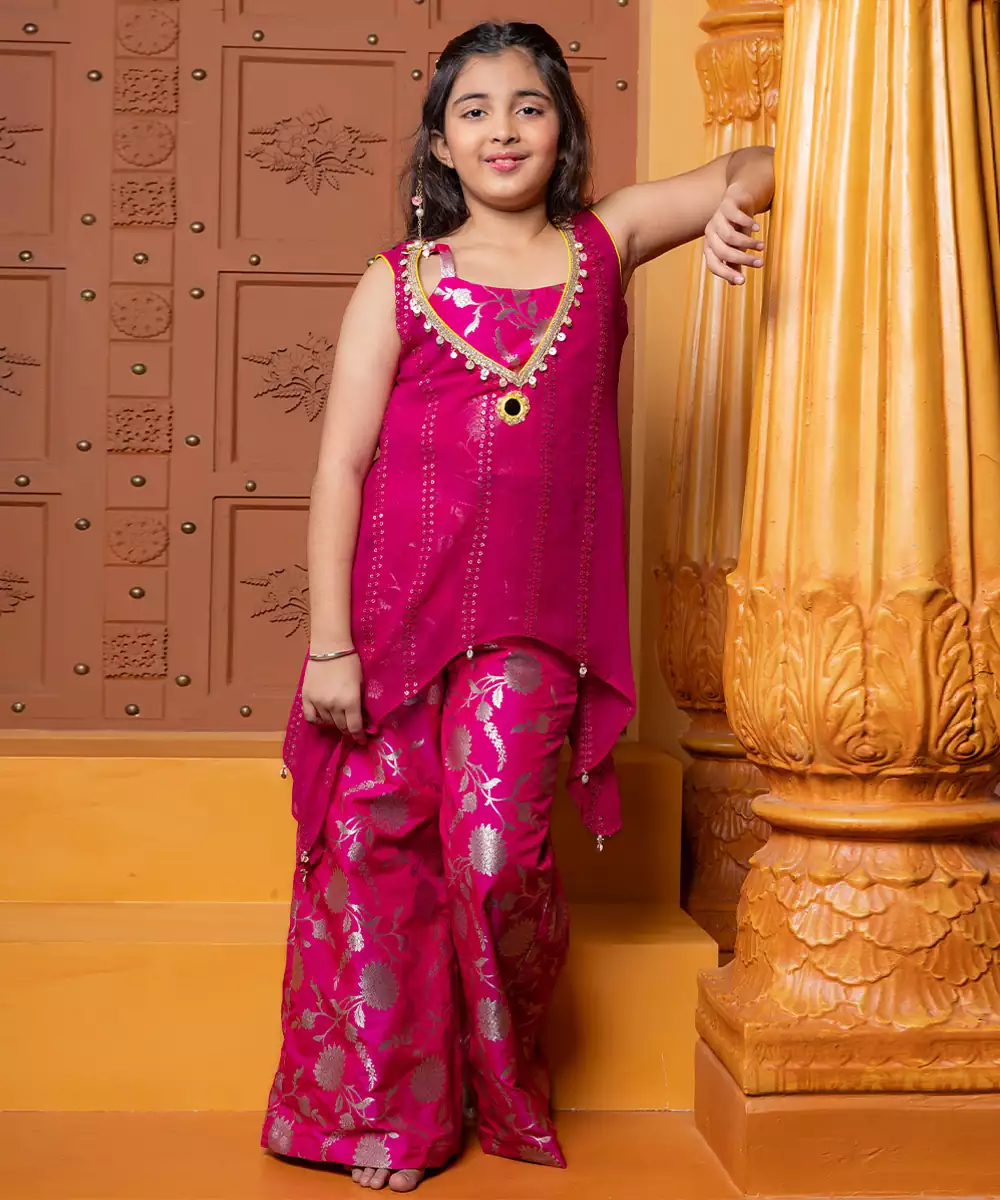 A Lovely And Feminine Ensemble, This Pink Georgette Co Ord Set Is Detailed With Exquisite Embroidery. The Lightweight, Flowing Georgette Fabric Drapes Beautifully, Giving The Sharara Pants An Airy, Voluminous Flare. The Intricate Embroidery Adds A Touch Of Traditional Artistry And Elegance, Making This A Perfect, Graceful Choice For Festive Or Special Occasions