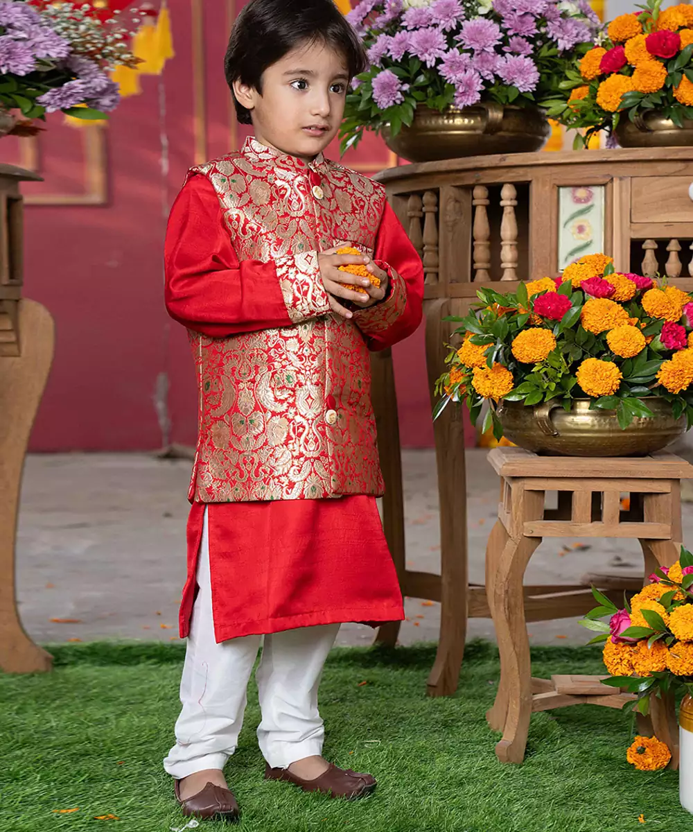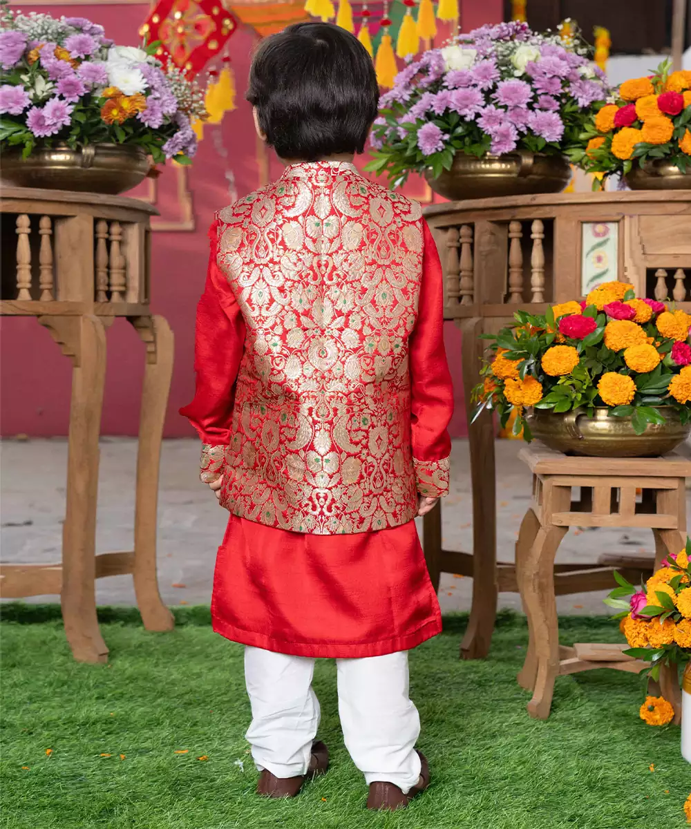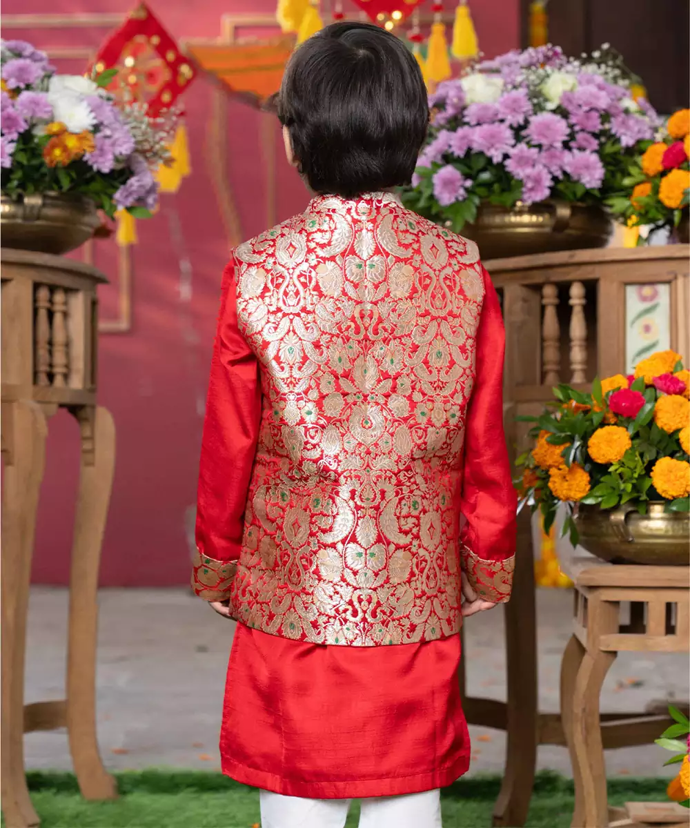 This Red Embroidered Pure Brocade Silk Nehru Jacket Set Radiates Regal Elegance And Luxurious Charm. Crafted From Rich Brocade Silk, It Features Intricate Embroidery That Adds A Sophisticated, Festive Touch. Perfect For Weddings And Special Occasions, It Offers A Polished Look, Comfortable Fit, And Timeless Ethnic Appeal.