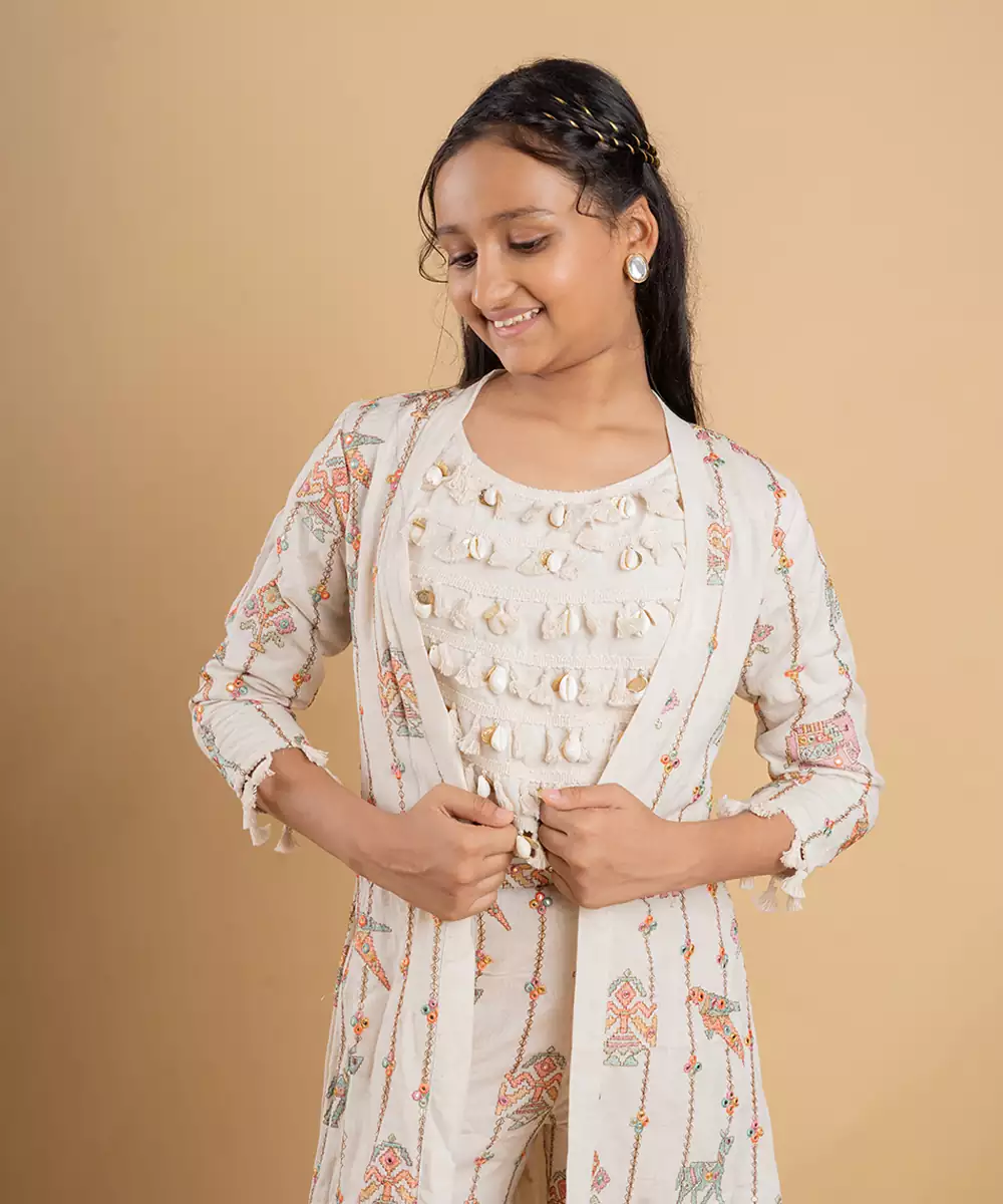 It Is Embellished With Horizontal Rows Of Cream Colored Tassels, Adding Texture And A Playful Element To The Outfit.