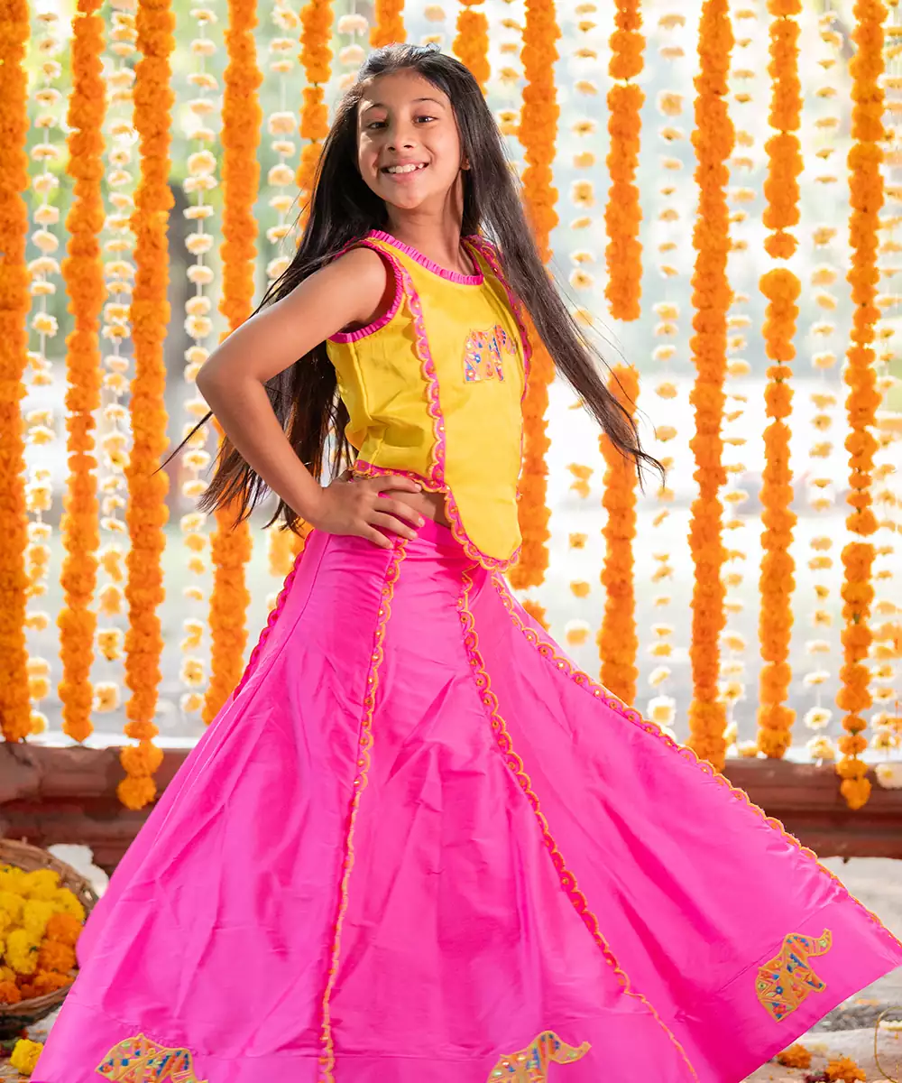 Pink Lehenga With Elephantmotif Embroidery. Paired With A Yellow Embroidered Blouse With Scallop Details. Colour : Pink Fabric : Cotton Components : 2 (Blouse,Lehenga) Work : Embroidered
