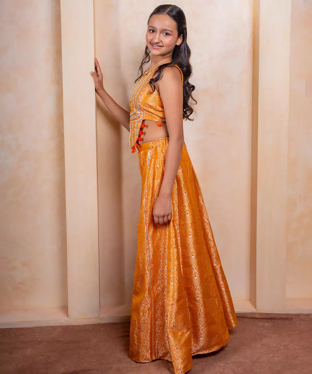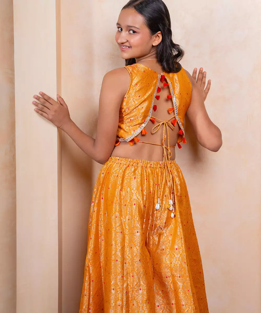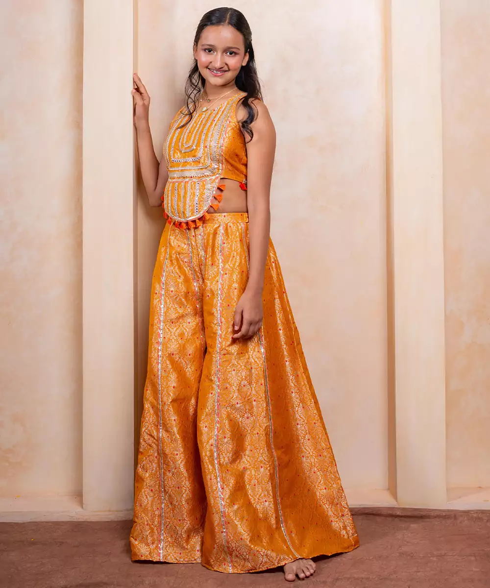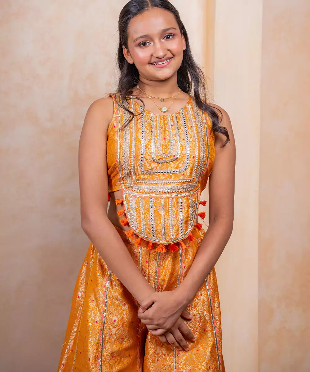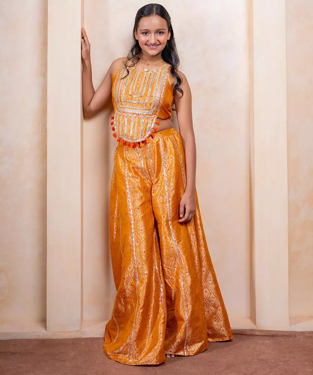 A Stunning And Opulent Choice, This Yellow Brocade Co Ord Set Features Rich Embroidery. The Brocade Fabric Offers A Beautiful, Structured Texture And Luxurious Feel, While The Embroidery Adds Intricate, Traditional Detailing. This Matching Set Provides A Polished, Festive, And Eye Catching Look, Perfect For Celebrations