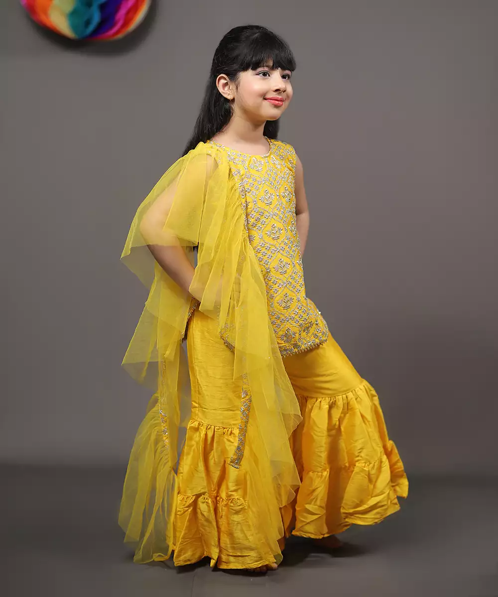Yellow Embroidered Kurta With Sharara And Net Dupatta.