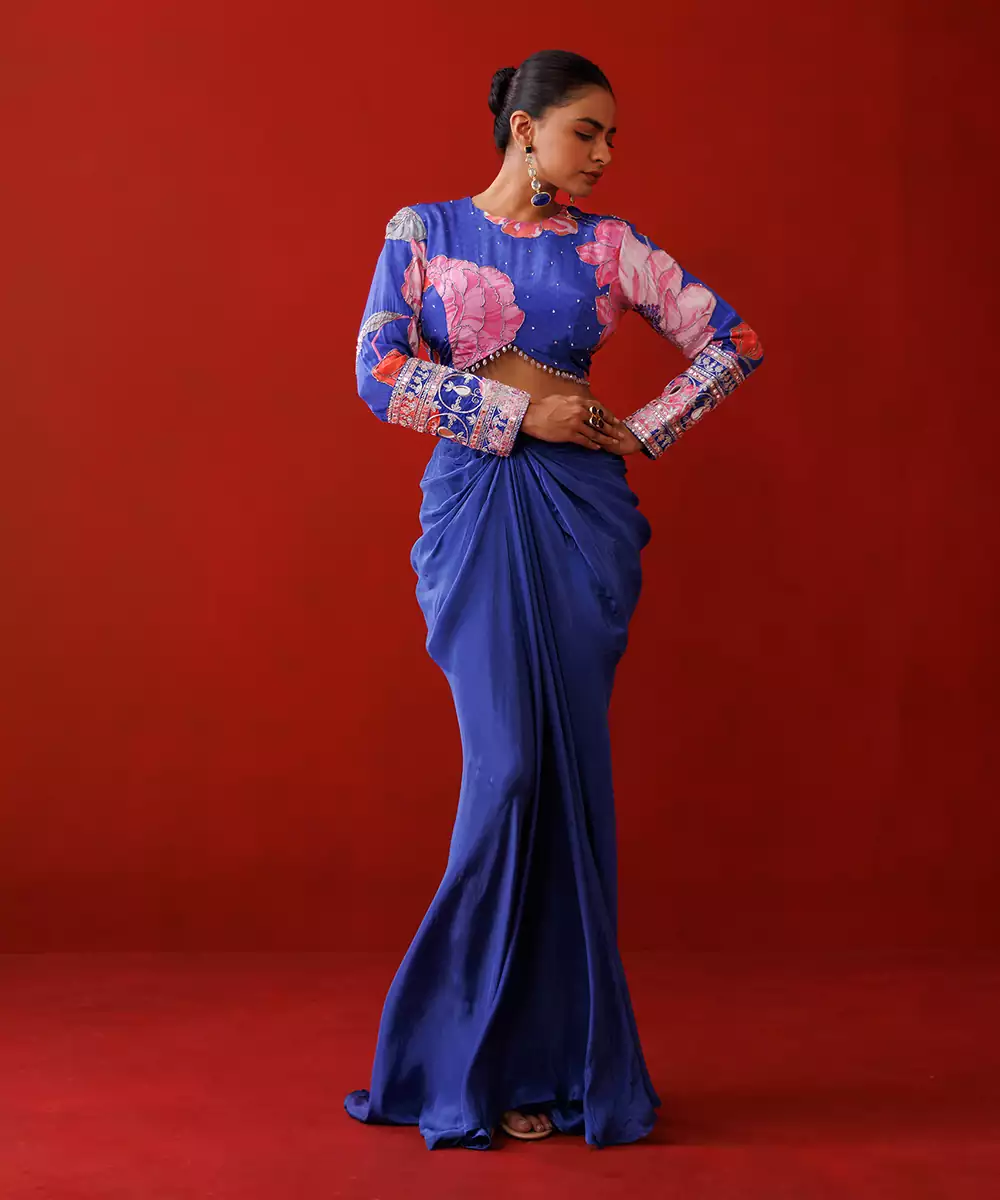 Featuring The Set Comes With A Full Sleeves Printed And Embroidered Blouse With A Mid Drape Skirt. The Sleeves Of The Blouse Is Highlighted With A Dori Embroidered Broad Border And Drop Shaped Beads Are Hanged To Highlight The Waist. Color : Blue