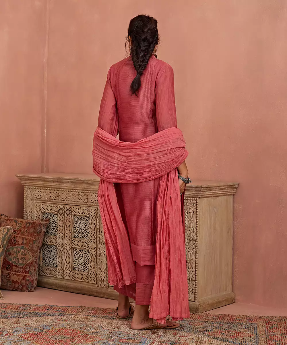Featuring A Coral Hand Woven Chanderi Kurta With Self Stripes. The Front Panels Are Accentuated With Floral Thread And Dori Embroidery. It Is Paired With A Chanderi Crushed Dupatta And Cotton Silk Pant. It Comes With A Cotton Slip. .