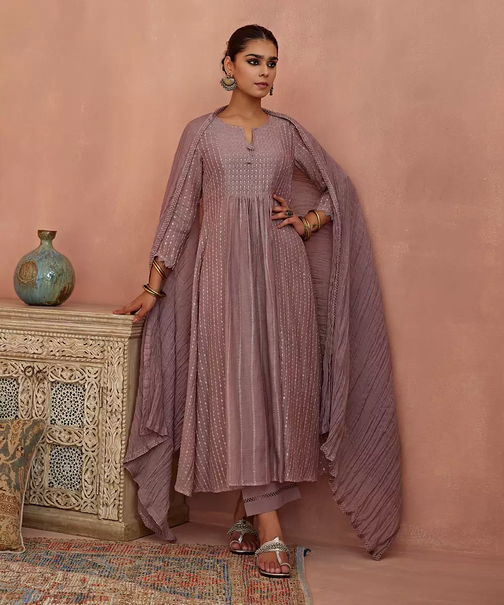 Featuring A Mauve A Line Kurta In Thread And Sequin Embroidered Chanderi Fabric, Paired With Crushed Chanderi Dupatta And Cotton Pant With Lace Detailings. It Comes With A Slip To Wear Underneath. .