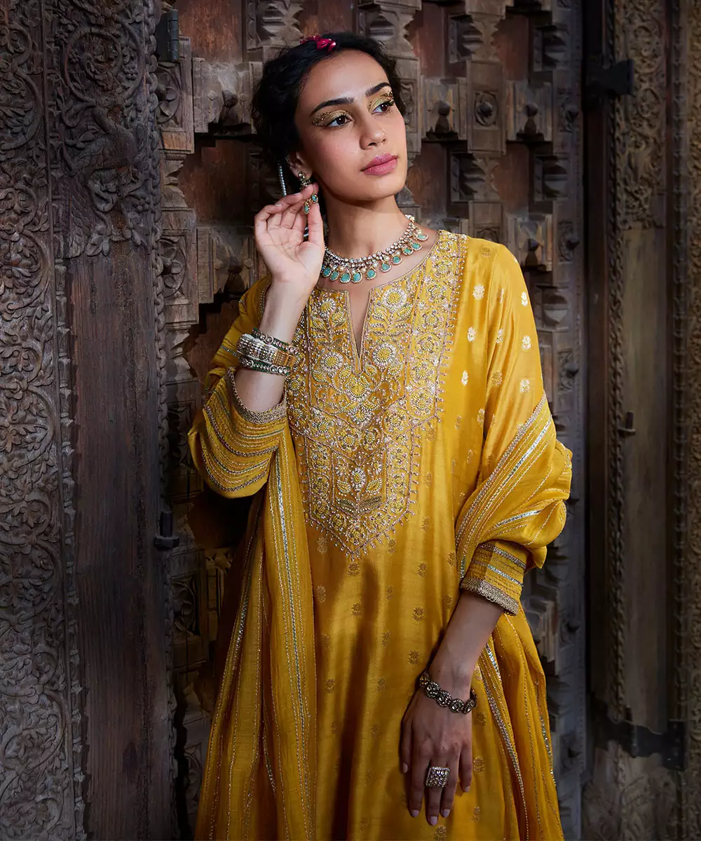 Gota Embroidered Yellow Kurta , Paired With Straight Pants And Chanderi Gota Stripes Dupatta. Here Is An Ensemble That Promises Everlasting Elegance Fabric Banarsi Chanderi/ Chanderi Kurta Length: 48 Pants Length: 38