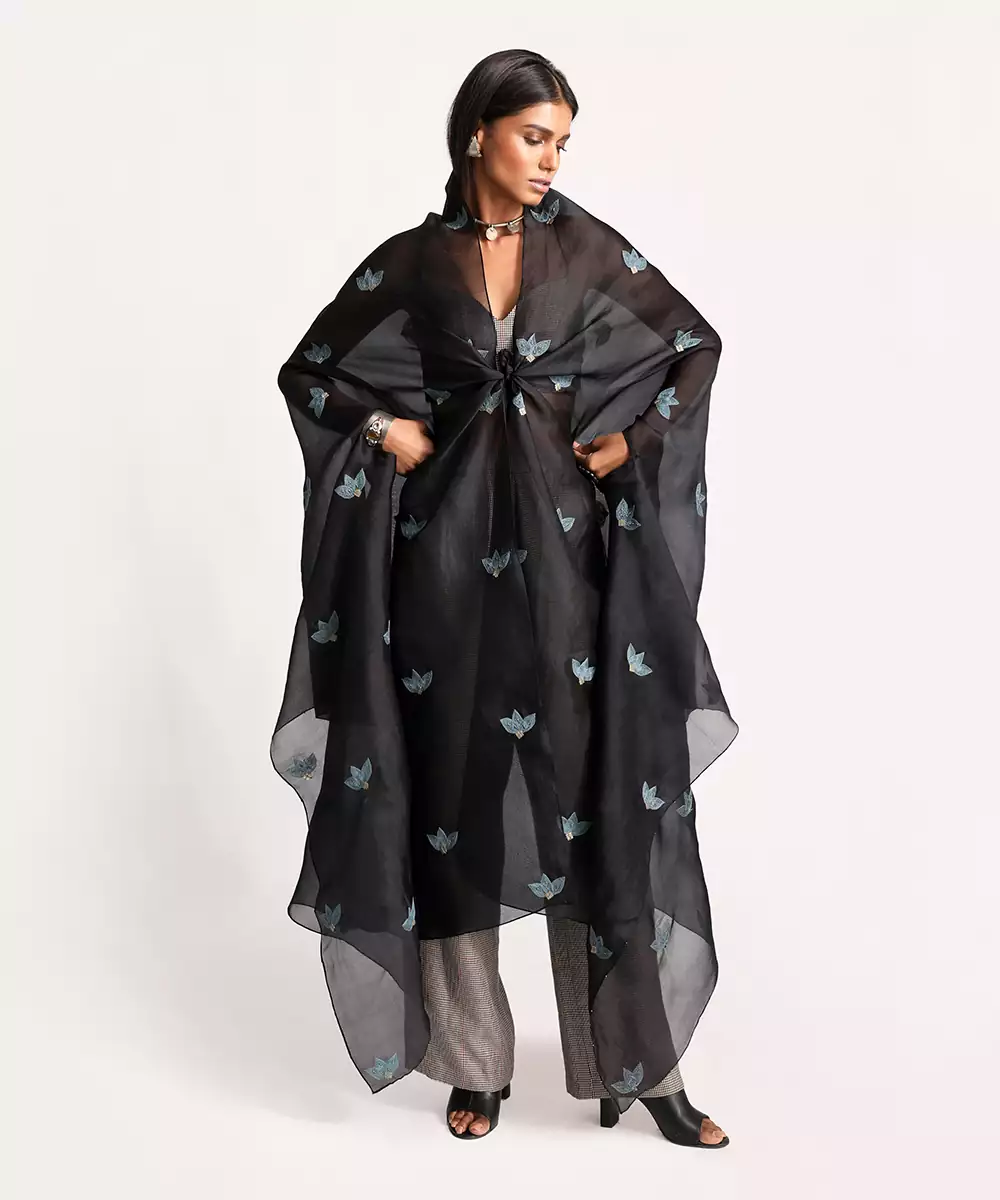 The Front Knot Organza Silk Sheer Cape With Hand Embroidered Lotus Motifs Is Paired With A Bustier And Formal Trousers In Houndstooth Checks For A Complete Fusion Look.