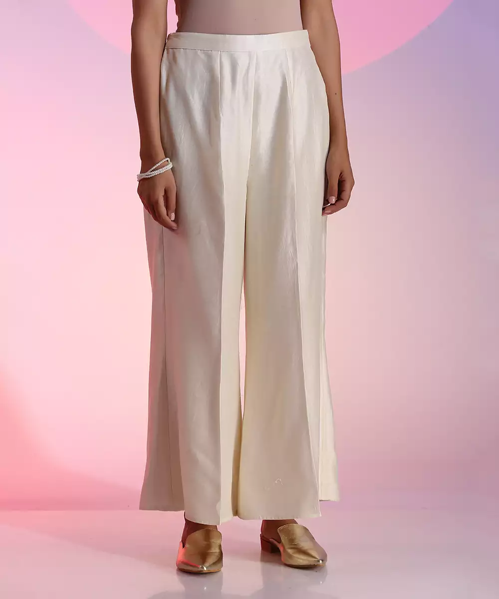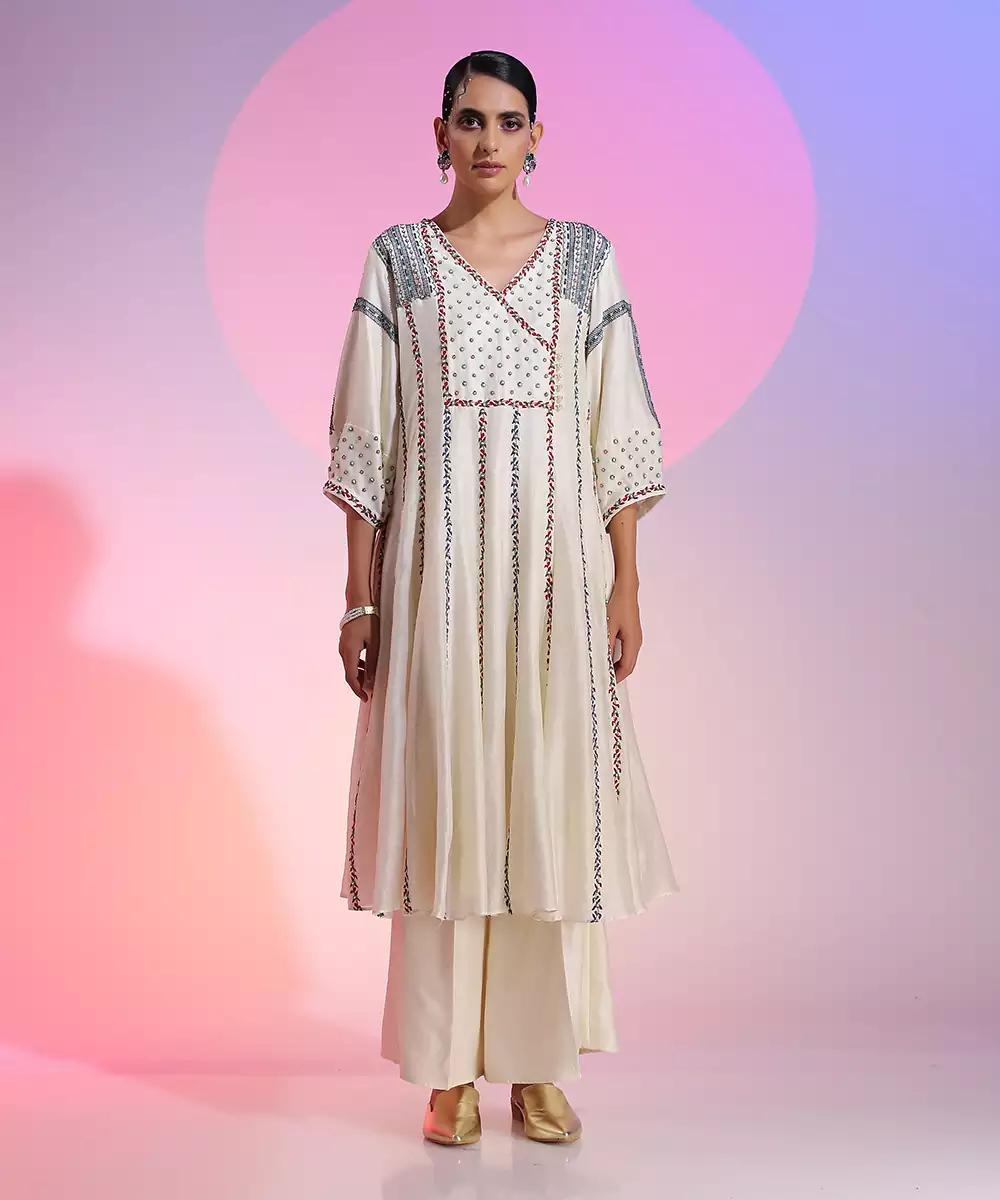 An Ivory Kalidar, Features Resham And Beadwork, With Heavy Detailing On The Shoulder. Styled With A Pair Of Ivory Pants.