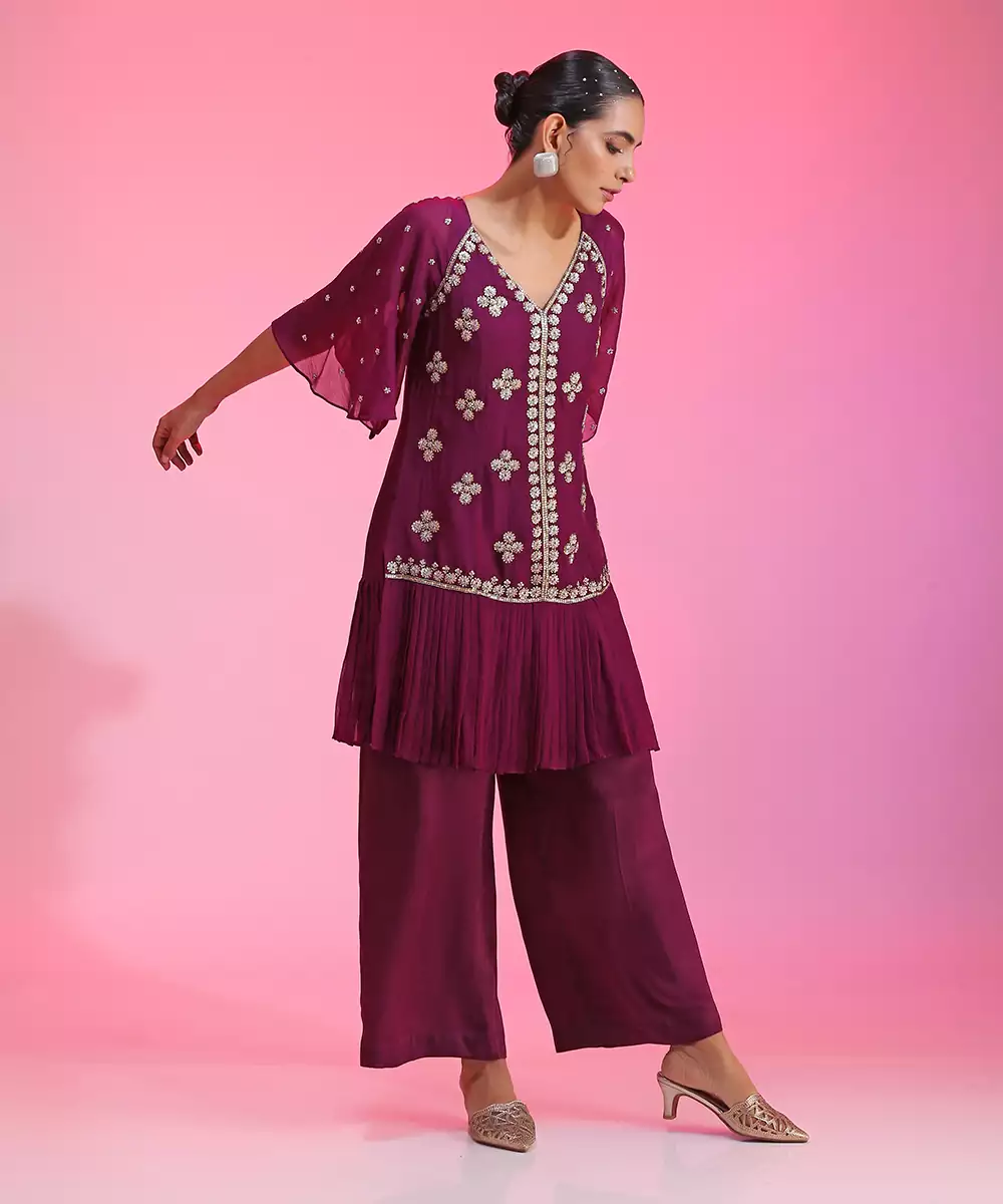 An Overlay Tunic Hand Embellished In Silver And Gold Tones, Pretty Floral Motifs And Delicate Details Contrasted With The Fabrics Pleated Texture. Styled With Straight Cut Pants And An Inner Tunic.