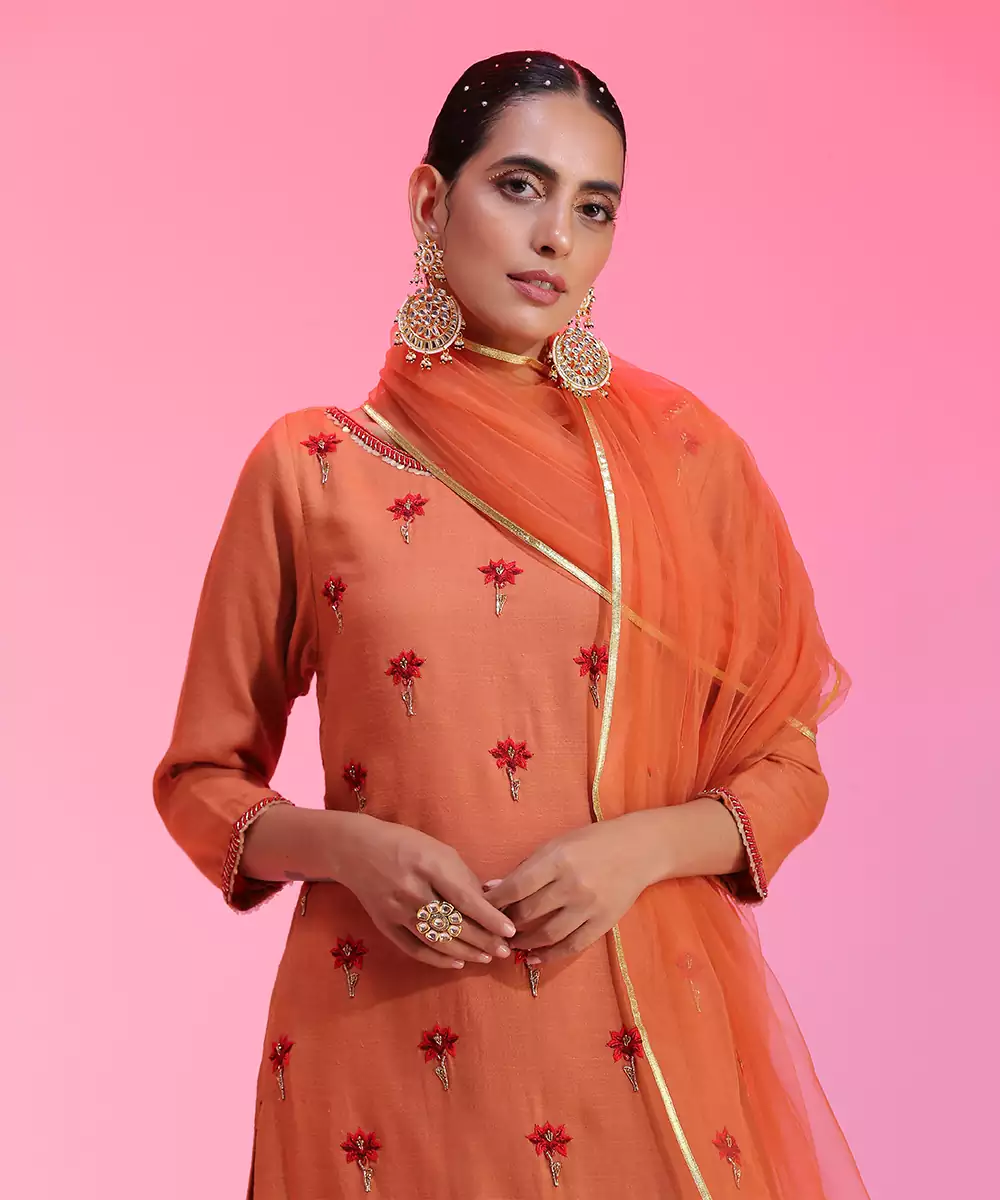 Featuring A Rust Colored Kurta In Modal Base With Resham, Dabka And Beaded Hand Embroidery. It Is Paired With A Matching Kalidar Palazzo Pants In Wrinkled Modal Base And Dupatta In Net Base With Gota Taping.