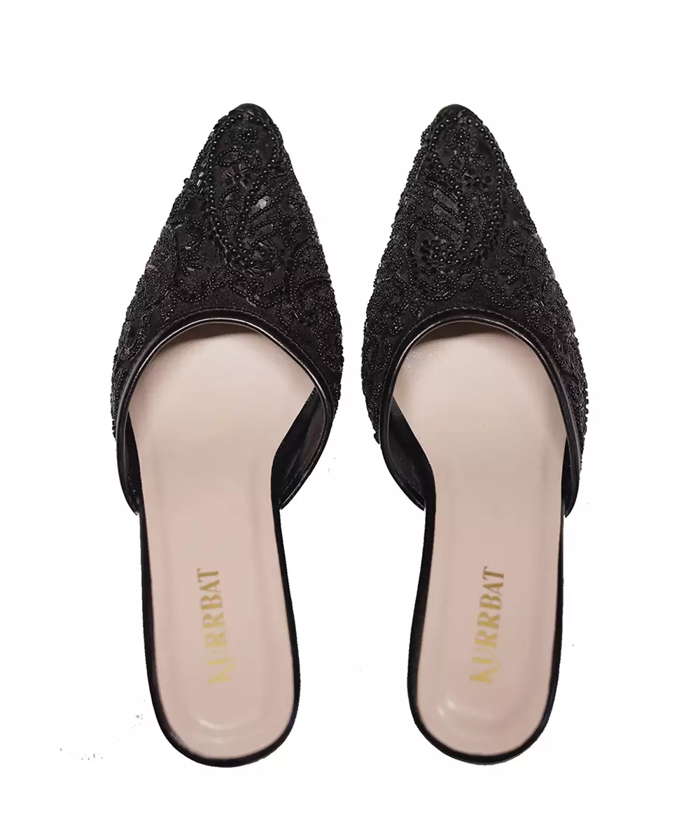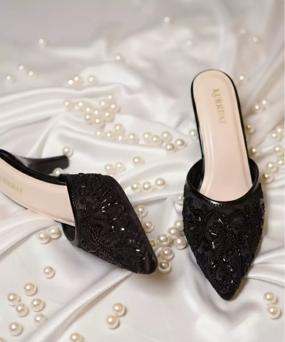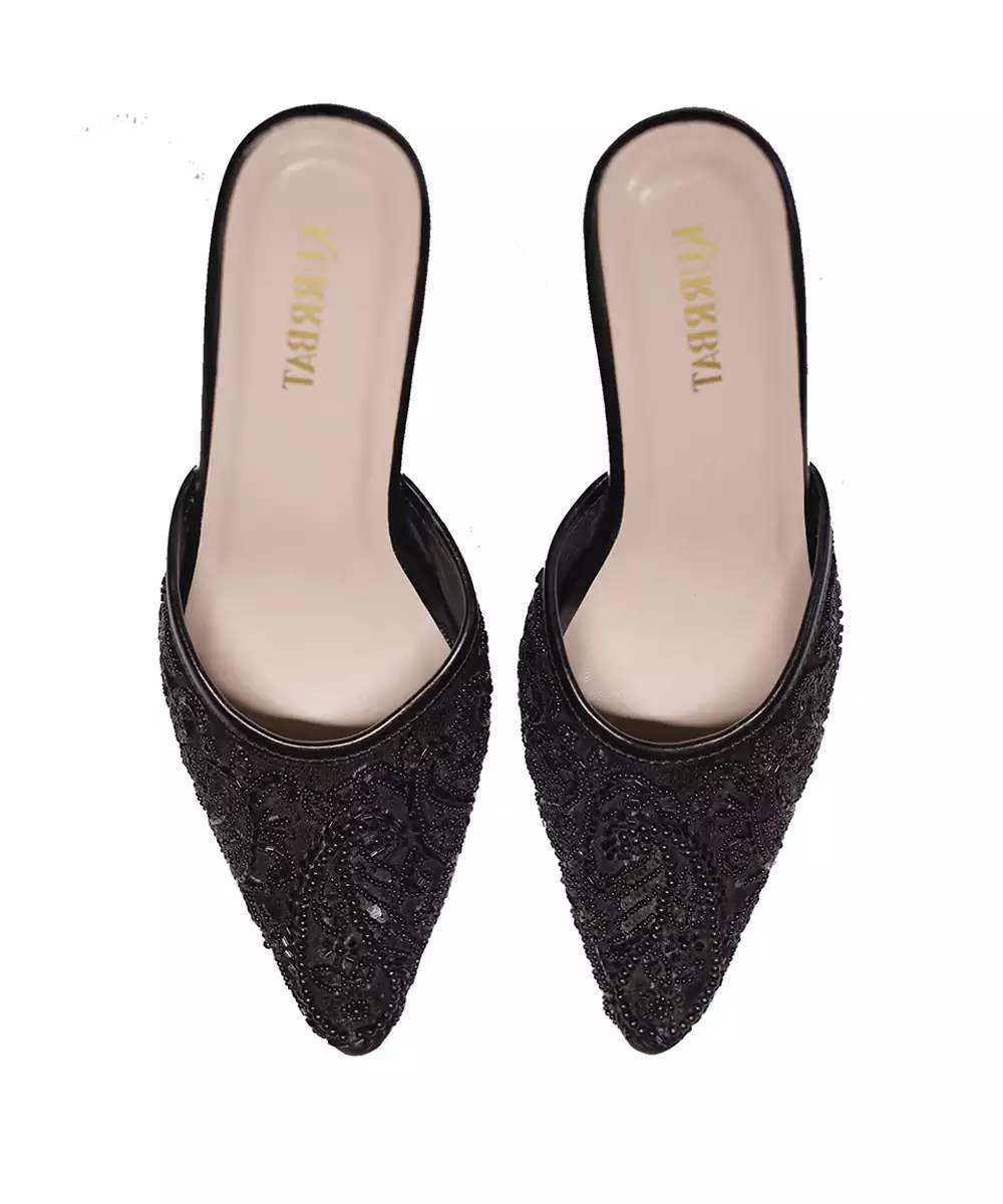 These Black Beads Embroidered Synthetic Heels Blend Modern Design With Festive Elegance. The Detailed Bead Embroidery Enhances Their Glamorous Appeal, While The Comfortable Heel Design Ensures Confident Wear. Perfect For Parties, Celebrations, And Pairing With Contemporary Or Ethnic Outfits.