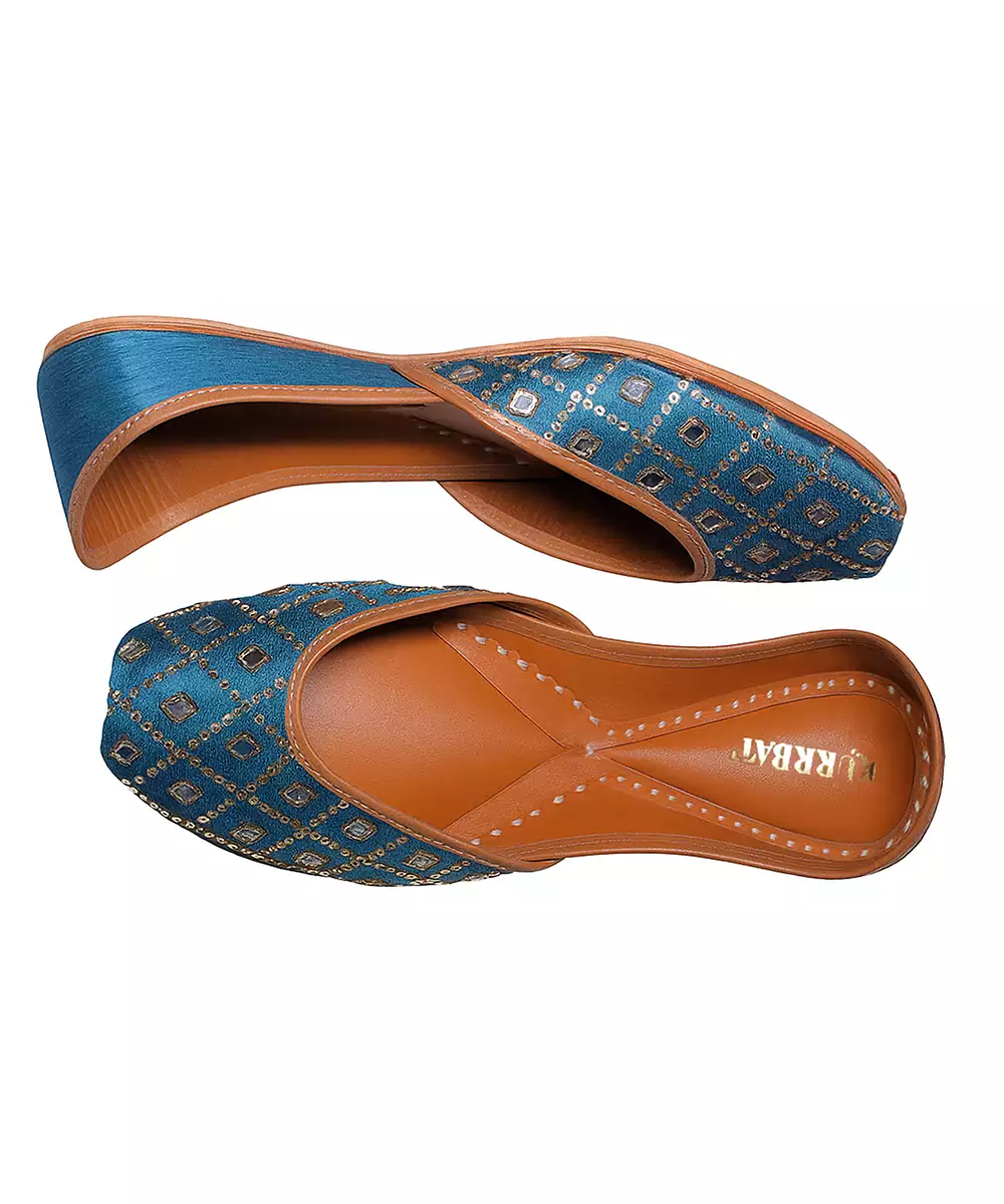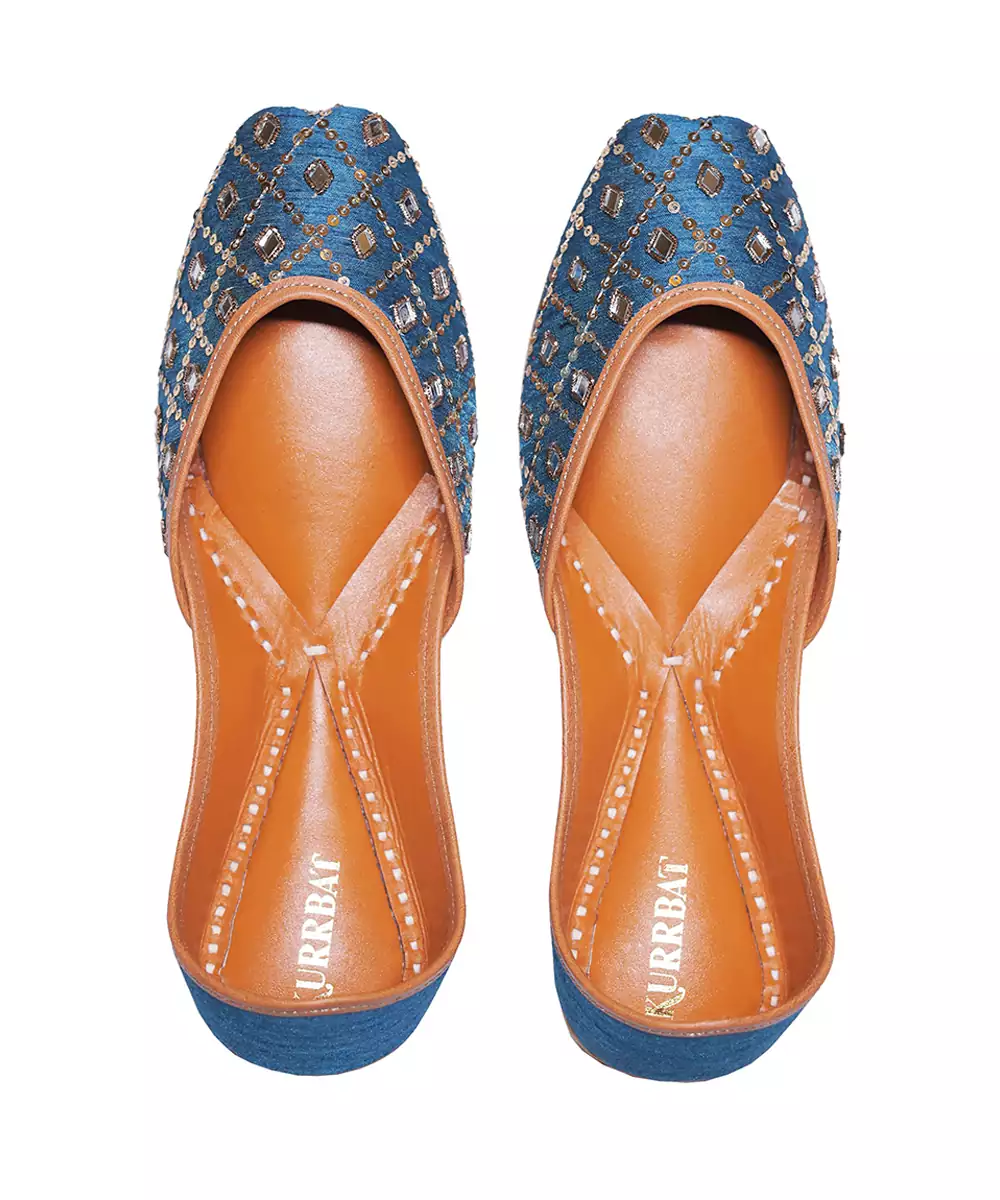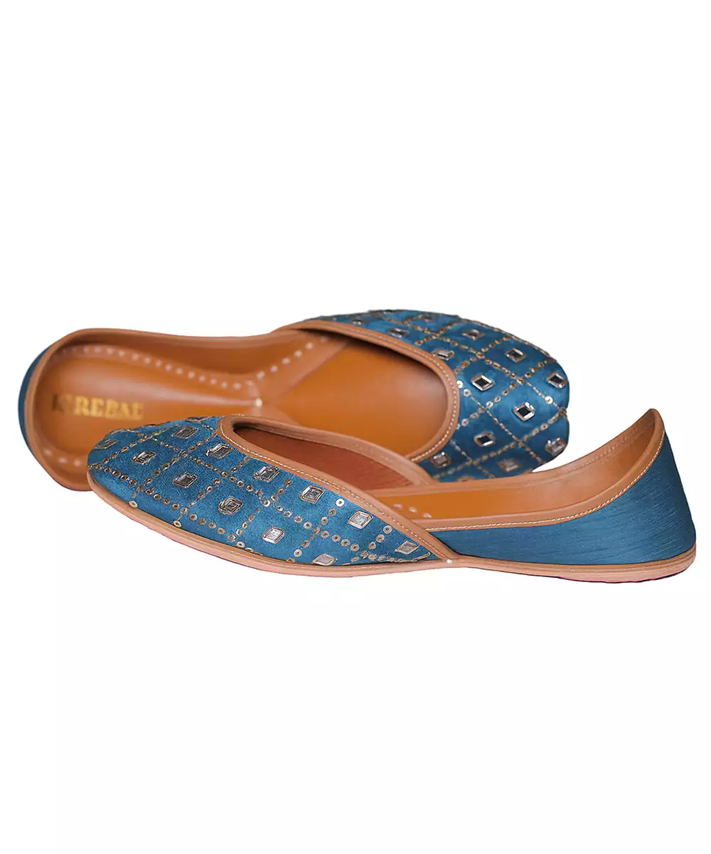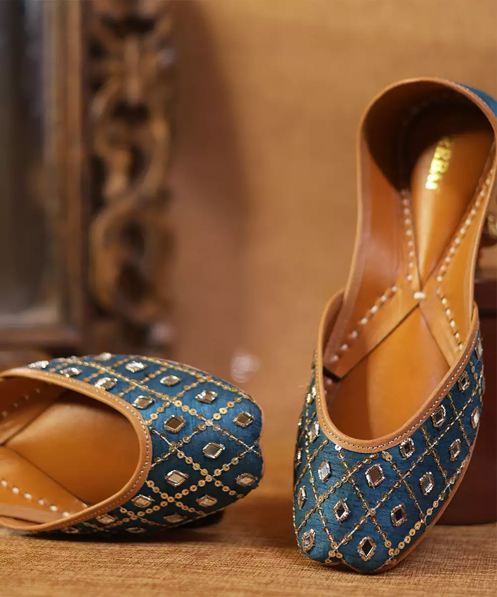 These Blue Embroidered Leather Juttis Showcase Elegant Craftsmanship With Vibrant Threadwork. Made From Soft Leather, They Offer Both Comfort And Durability. The Intricate Embroidery Adds Festive Charm, Making Them Perfect For Weddings, Cultural Gatherings, And Pairing With Ethnic Outfits.