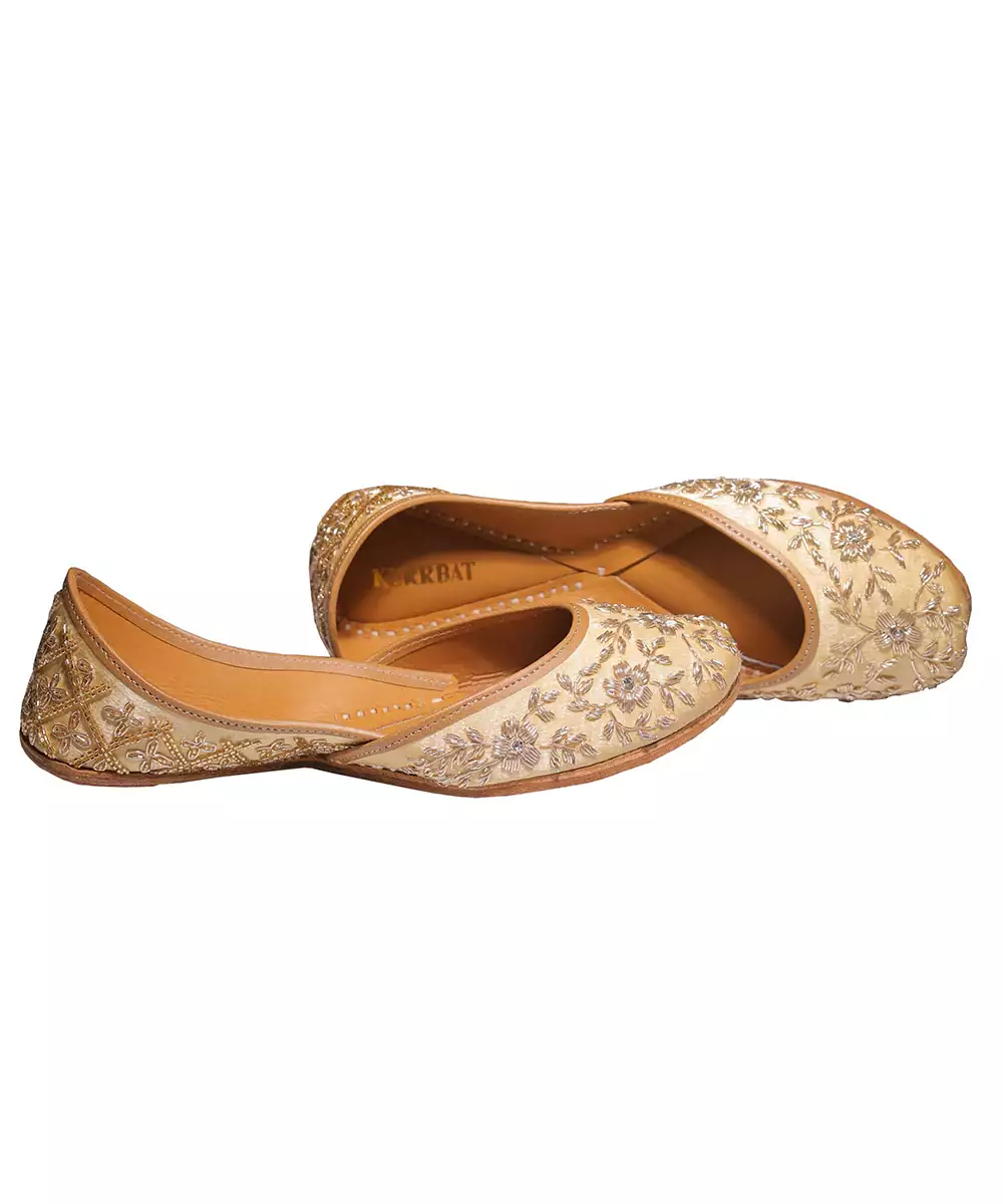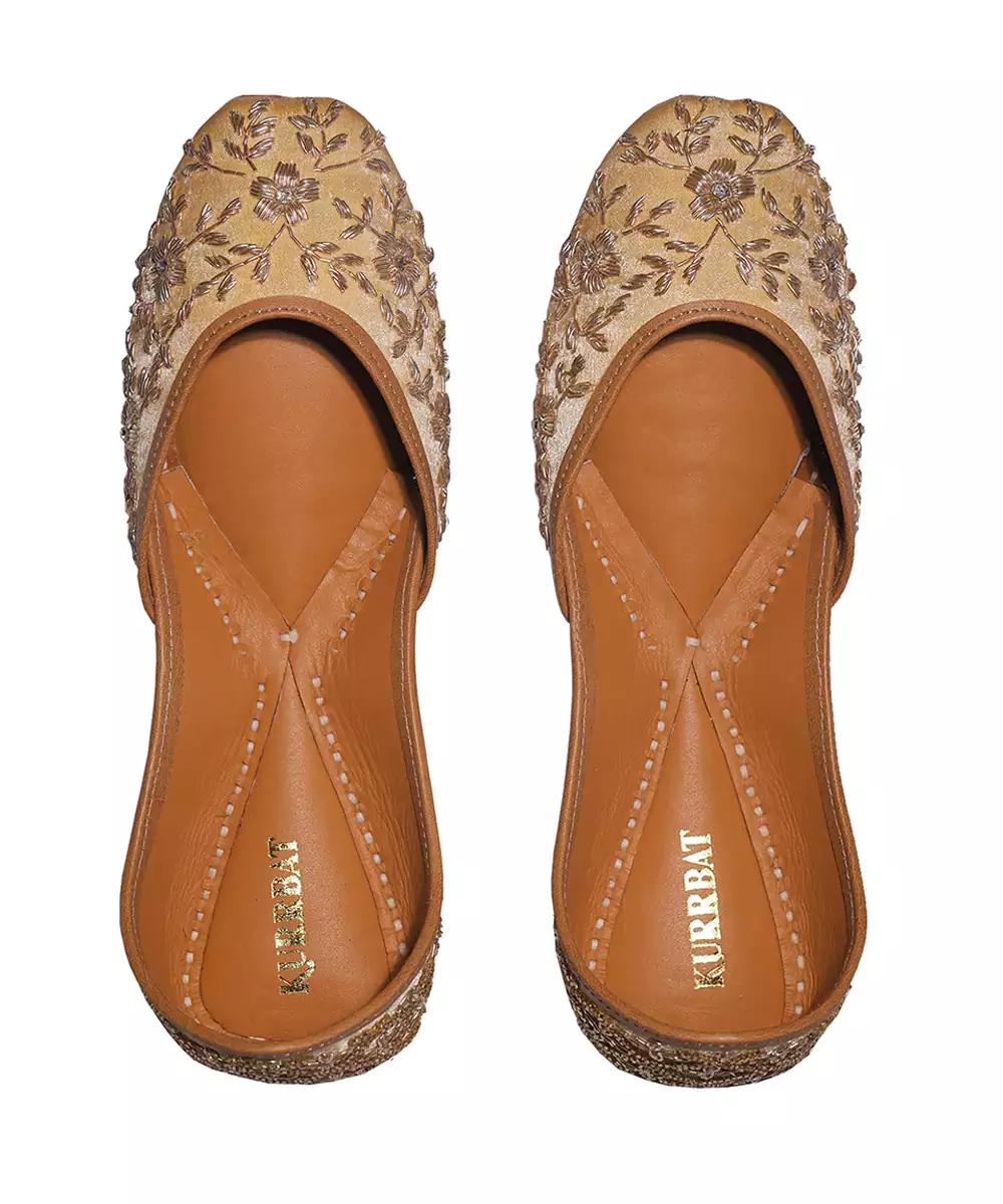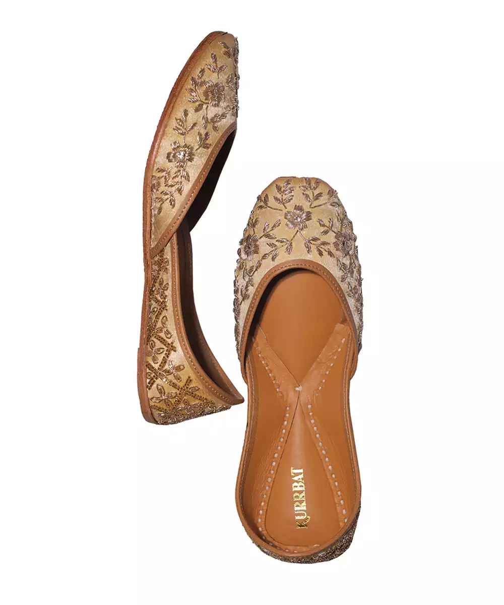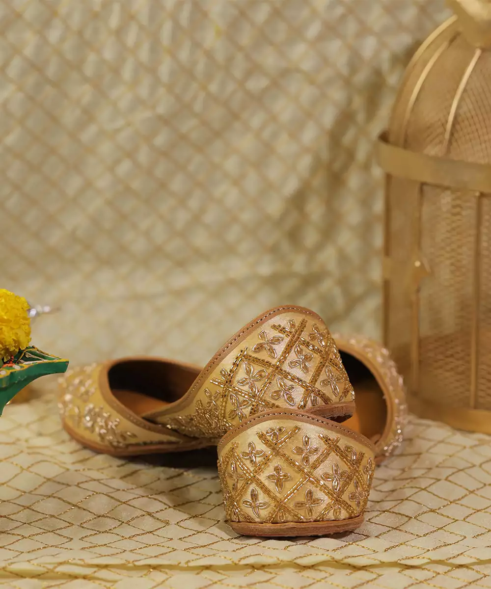 These Gold Embroidered Leather Juttis Reflect Classic Festive Elegance With Intricate Detailing. The Soft Leather Construction Ensures Comfort While The Delicate Embroidery Enhances Their Luxurious Appeal. Perfect For Weddings, Celebrations, And Traditional Occasions, They Pair Beautifully With Ethnic Attire.