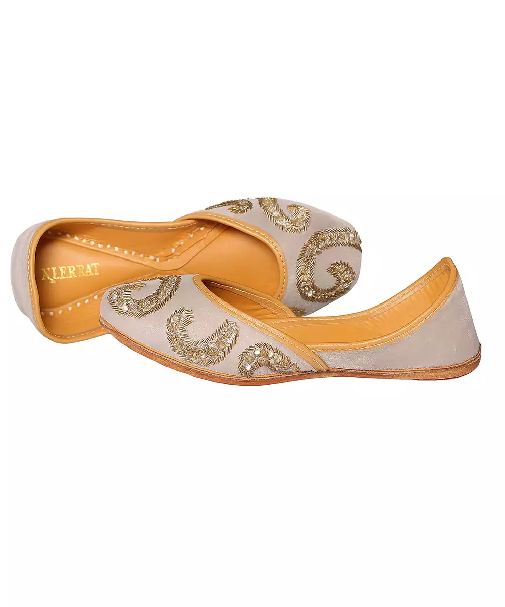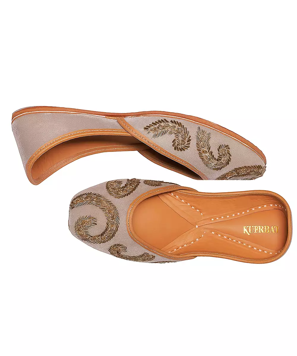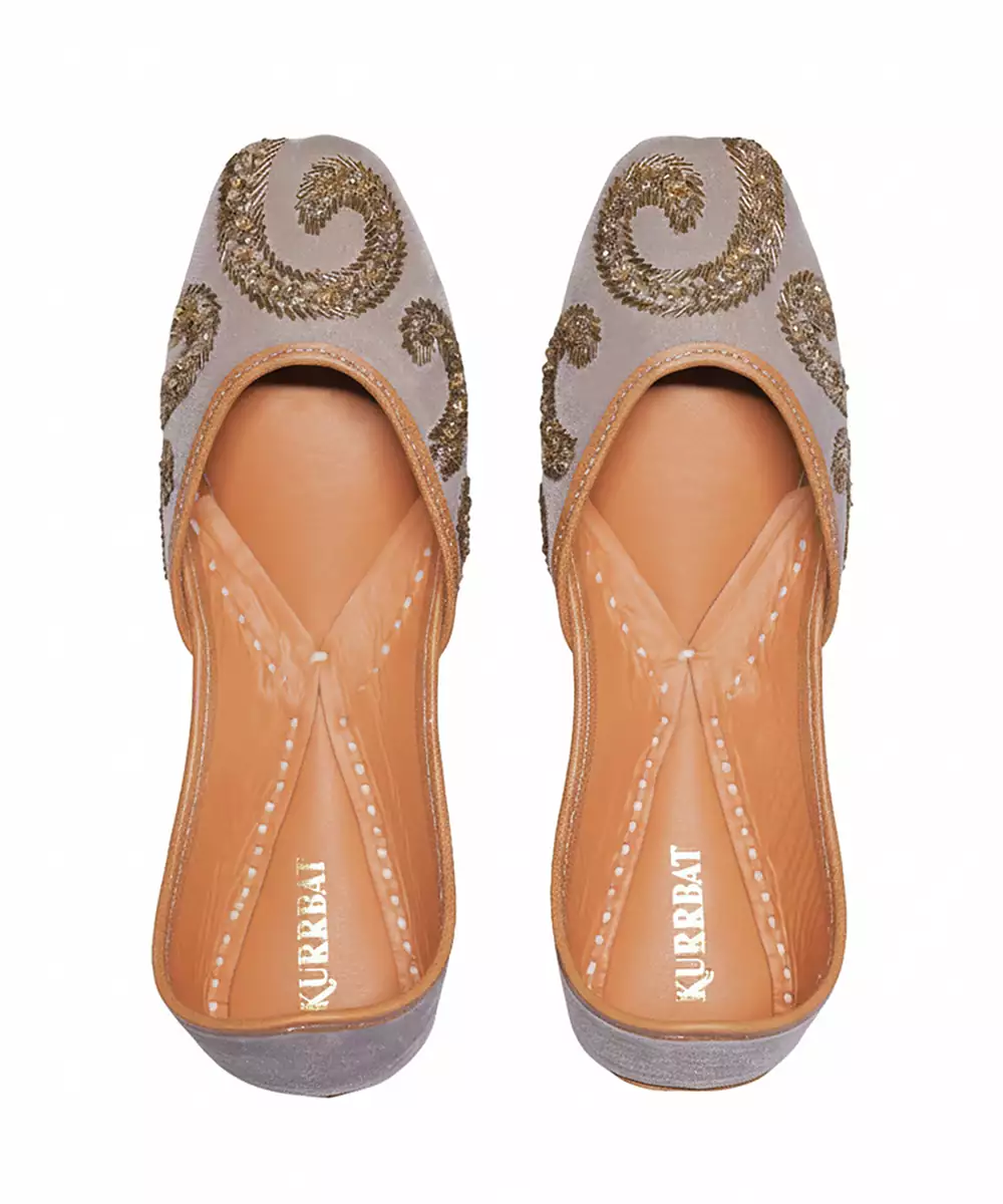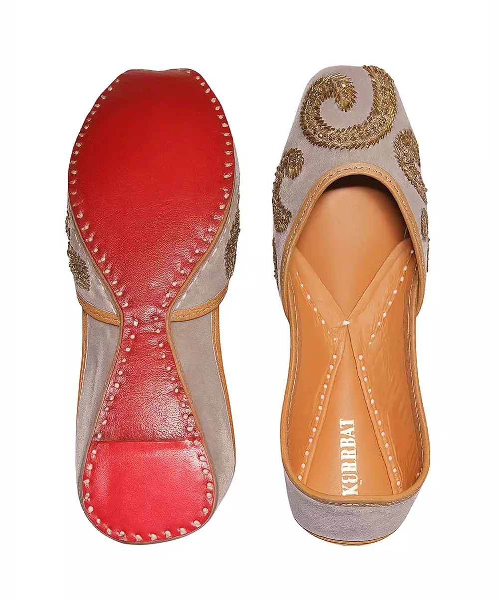 These Grey Embroidered Leather Juttis Showcase Refined Elegance With Delicate Embroidery On Soft Leather. Designed For Comfort And Durability, They Provide A Graceful Finishing Touch To Ethnic Outfits. Ideal For Festive Gatherings, Cultural Events, And Traditional Celebrations.