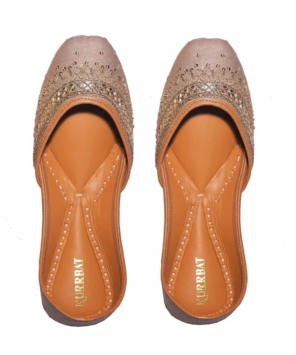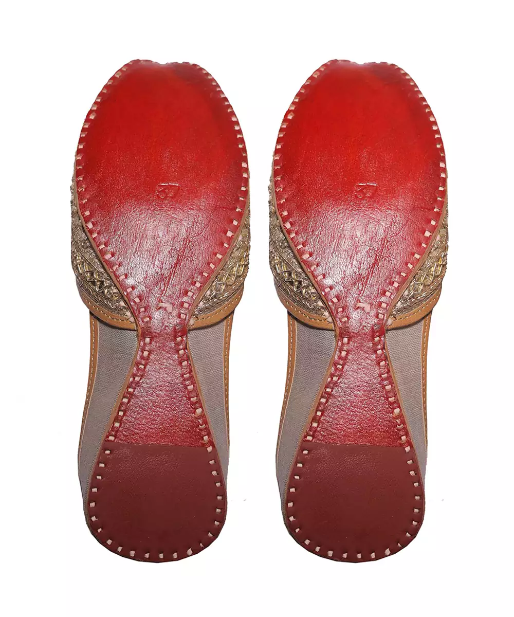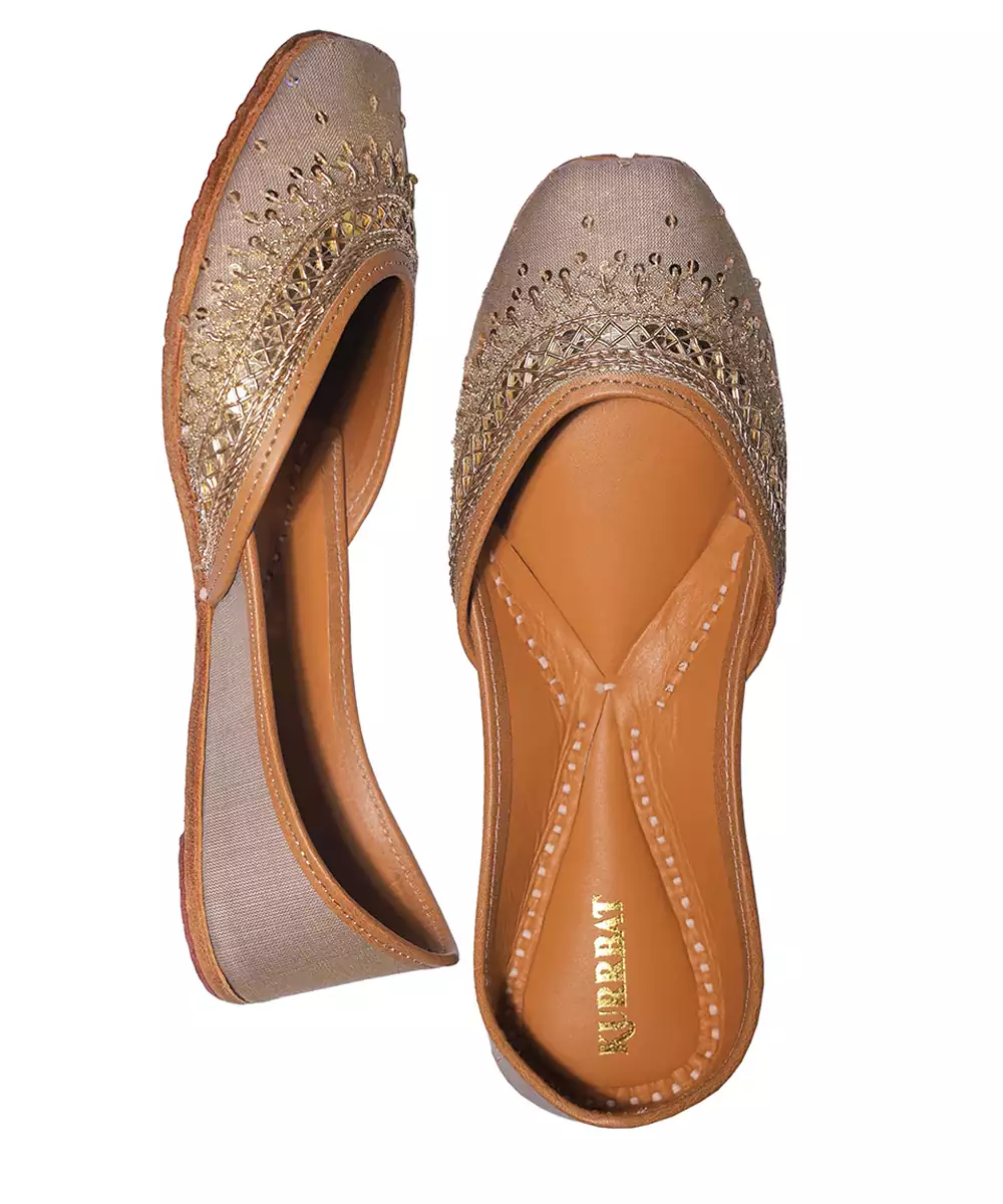These Muted Gold Embroidered Leather Juttis Offer Subtle Elegance With Refined Detailing. The Soft Leather Base Ensures Comfort While Intricate Embroidery Adds A Graceful Festive Touch. Ideal For Celebrations, Cultural Events, And Traditional Occasions, They Pair Beautifully With A Variety Of Ethnic Outfits.