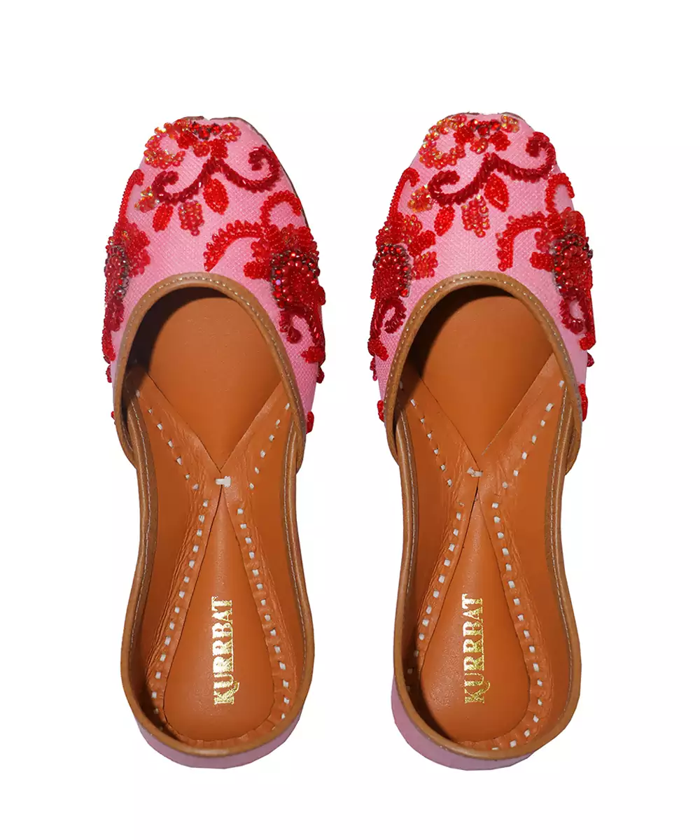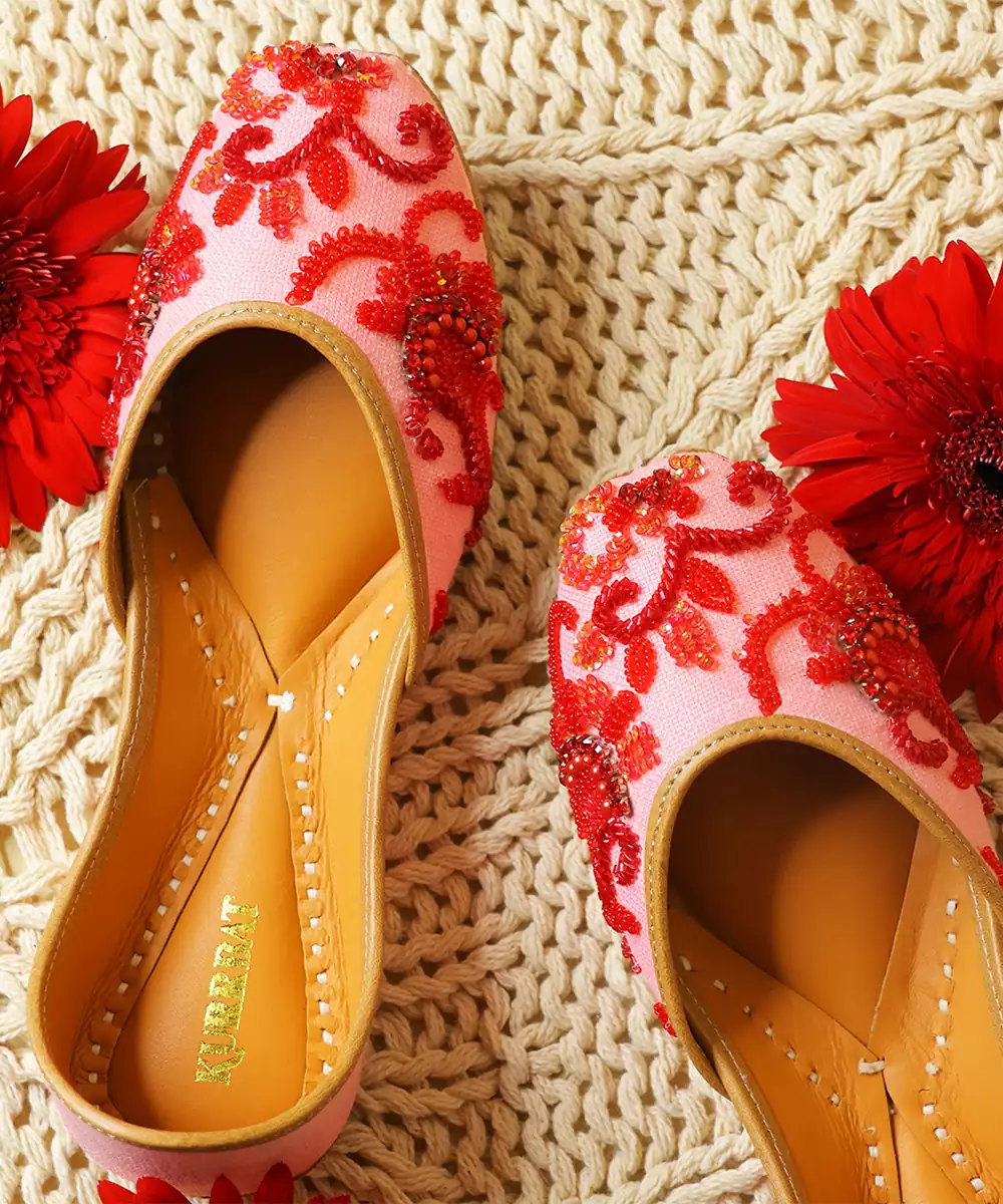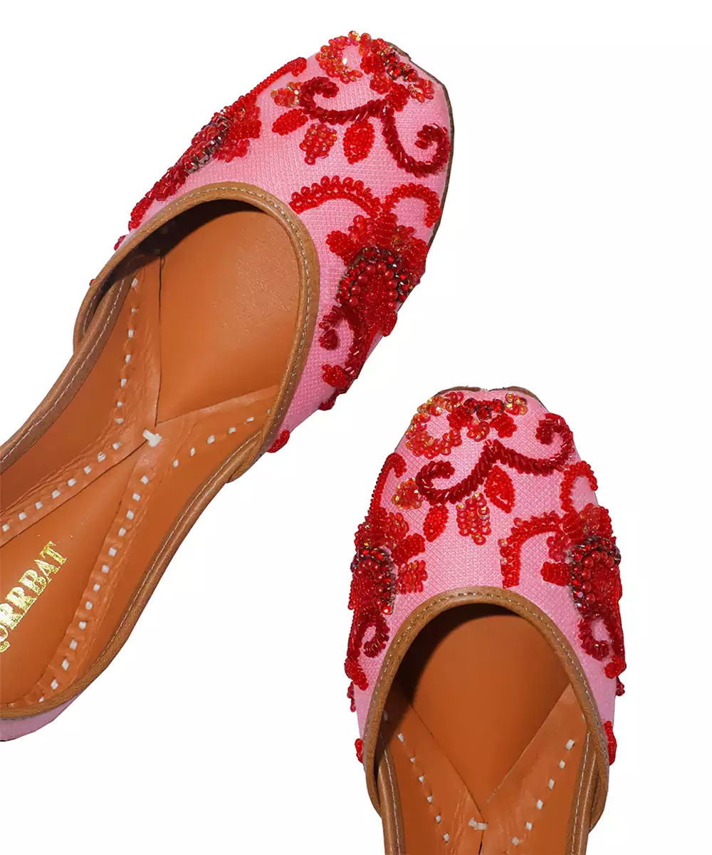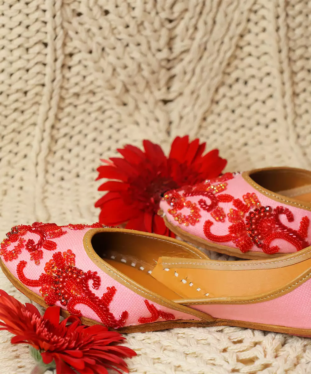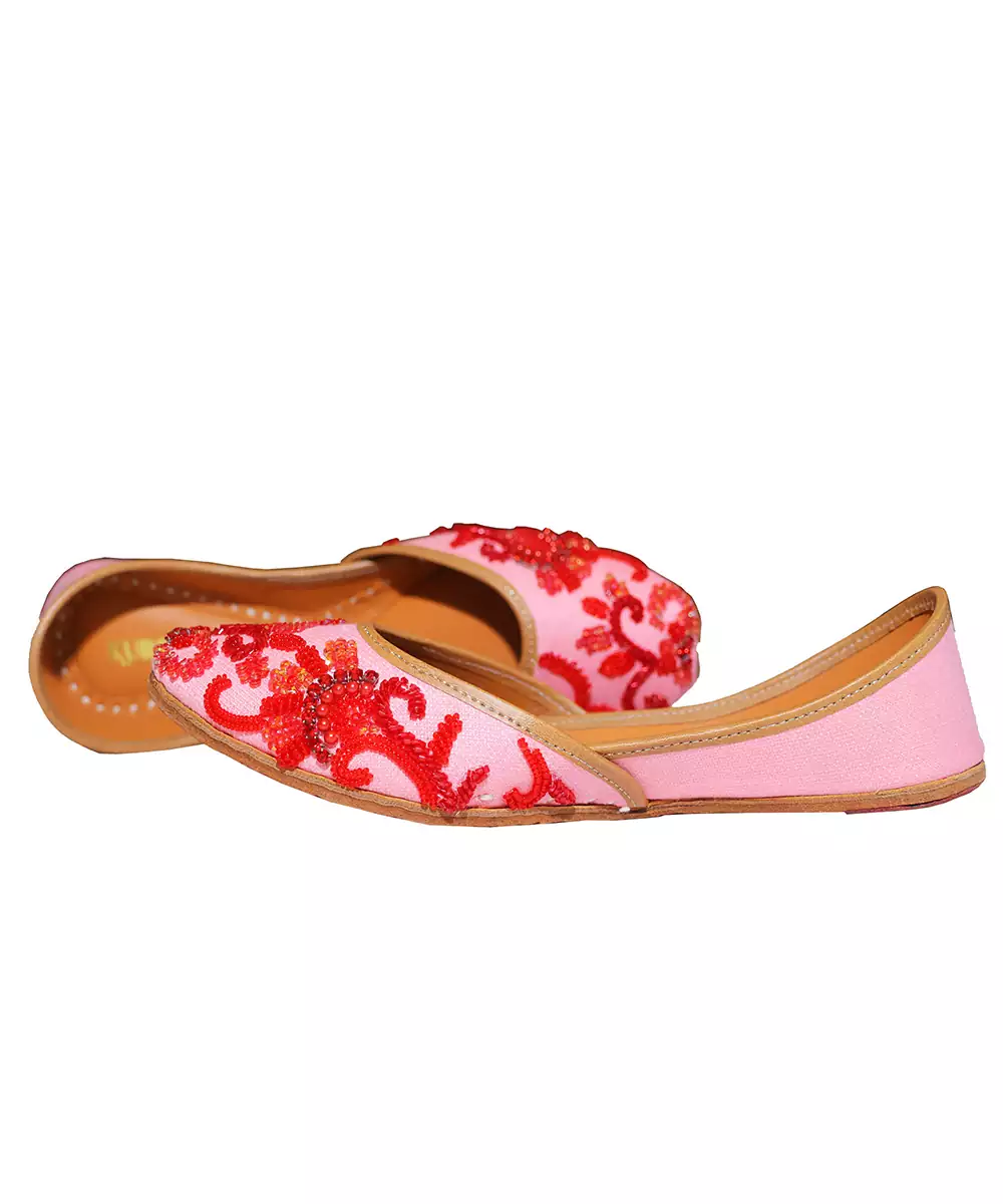 These Pink Embroidered Leather Juttis Combine Traditional Craftsmanship With Vibrant Elegance. Crafted From Soft Leather, They Feature Intricate Embroidery That Enhances Their Festive Charm. Designed For Comfort And Style, These Juttis Are Perfect For Weddings, Celebrations, And Pairing With Ethnic Outfits For A Graceful Traditional Look.