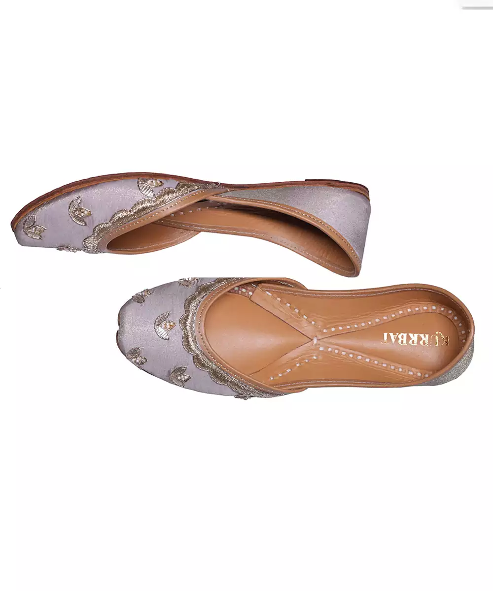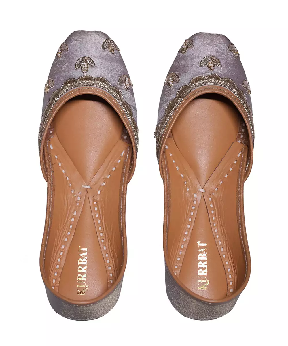 These Silver Grey Embroidered Leather Juttis Feature Delicate Threadwork That Enhances Their Graceful Appeal. The Soft Leather Construction Ensures Comfortable Wear While The Subtle Color Adds Sophistication. Ideal For Festive Occasions, Weddings, And Elegant Ethnic Styling.