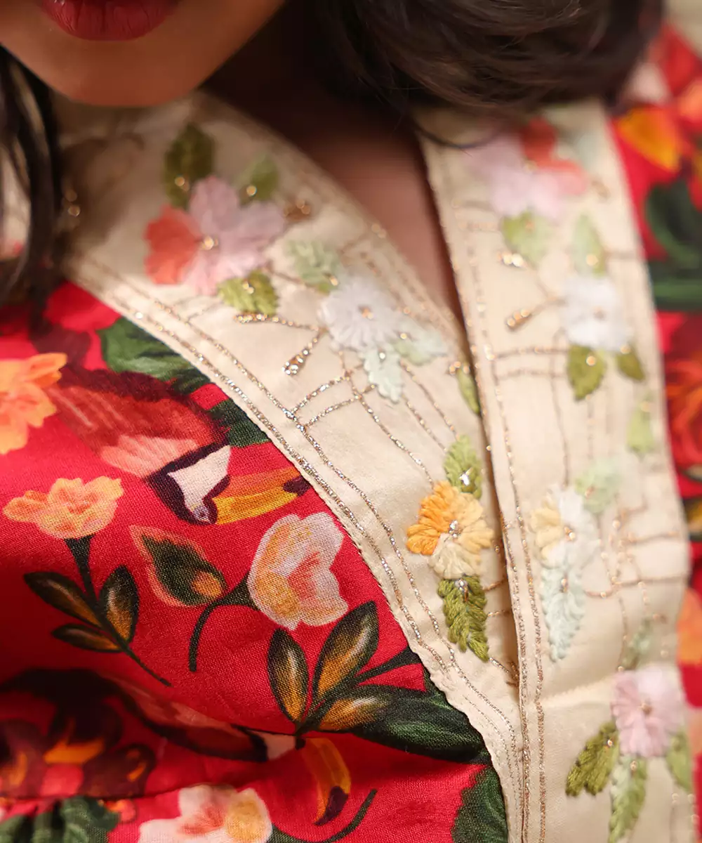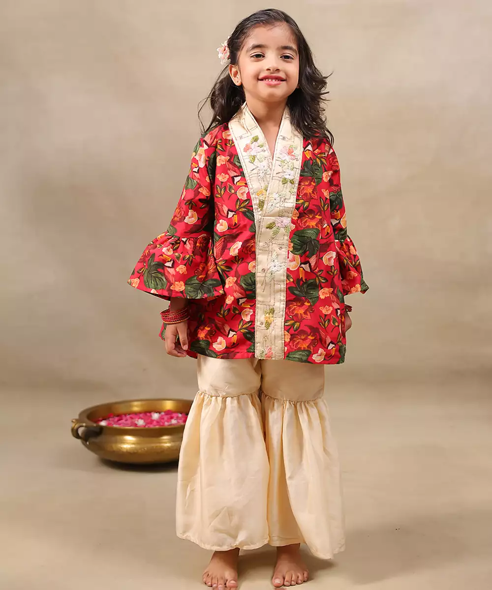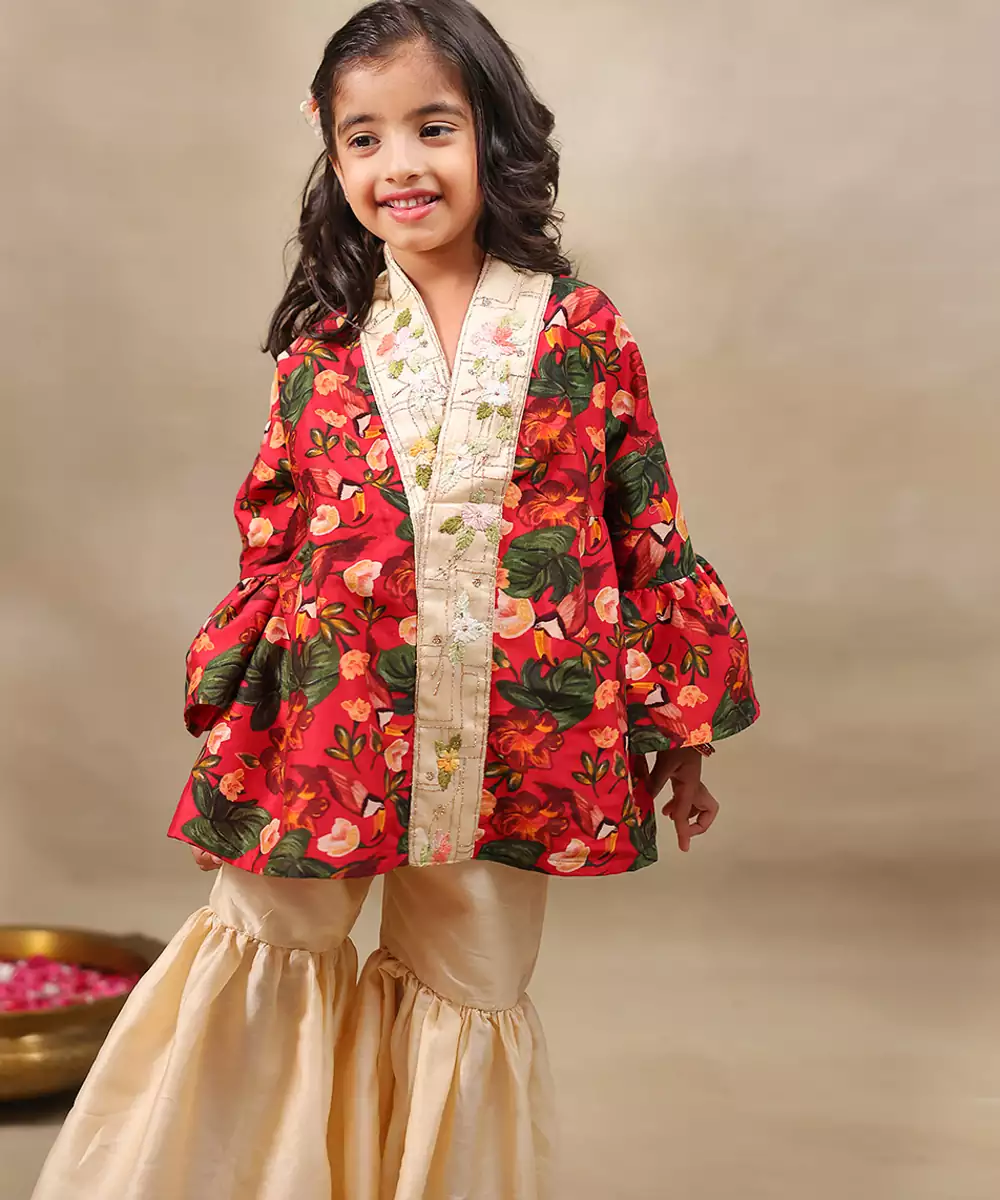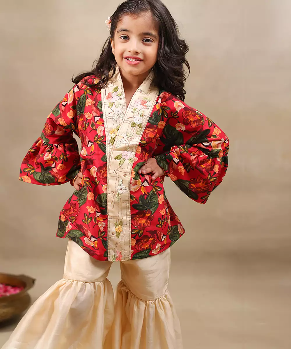 Bloom Boldly In The Gulbagh Blossom Set – Where Festive Flair Meets Little Girl Magic! Colour: Red Fabric: Chanderi Components: 1 Kurta / 1 Sharara