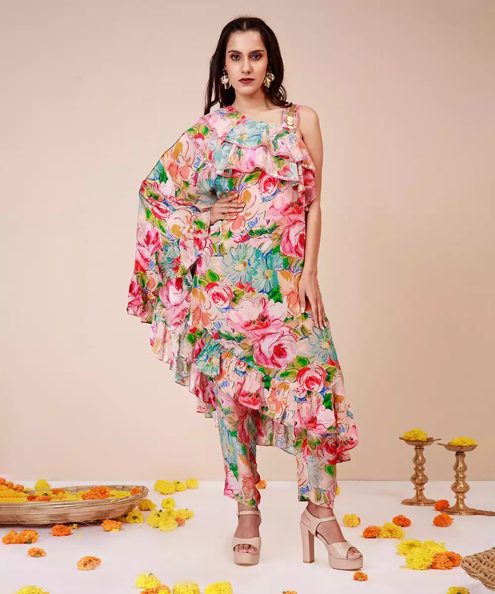 Bold Floral Frill Set Colour: Pink Fabric: Crepe Components : 1 Tunic / 1 Pant