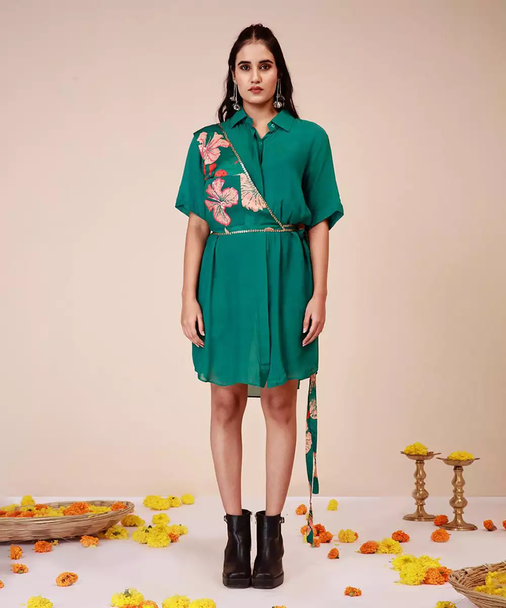 Hibiscus Shoulder Harness Shirt Dress, Hand Embroidery On The Harness Colour: Bottle Green Fabric: Modal Muslin Components : 1 Shoulder Harness / 1 Shirt Dress
