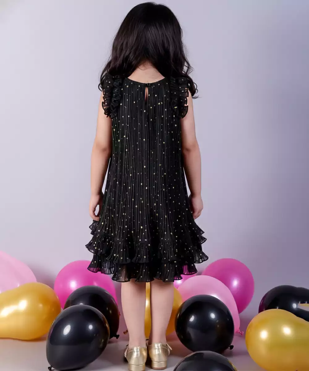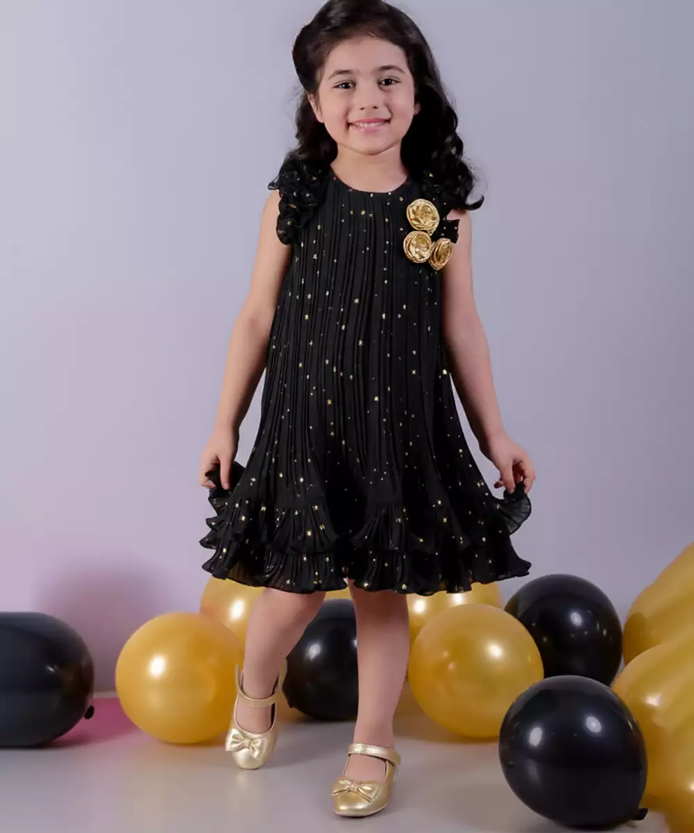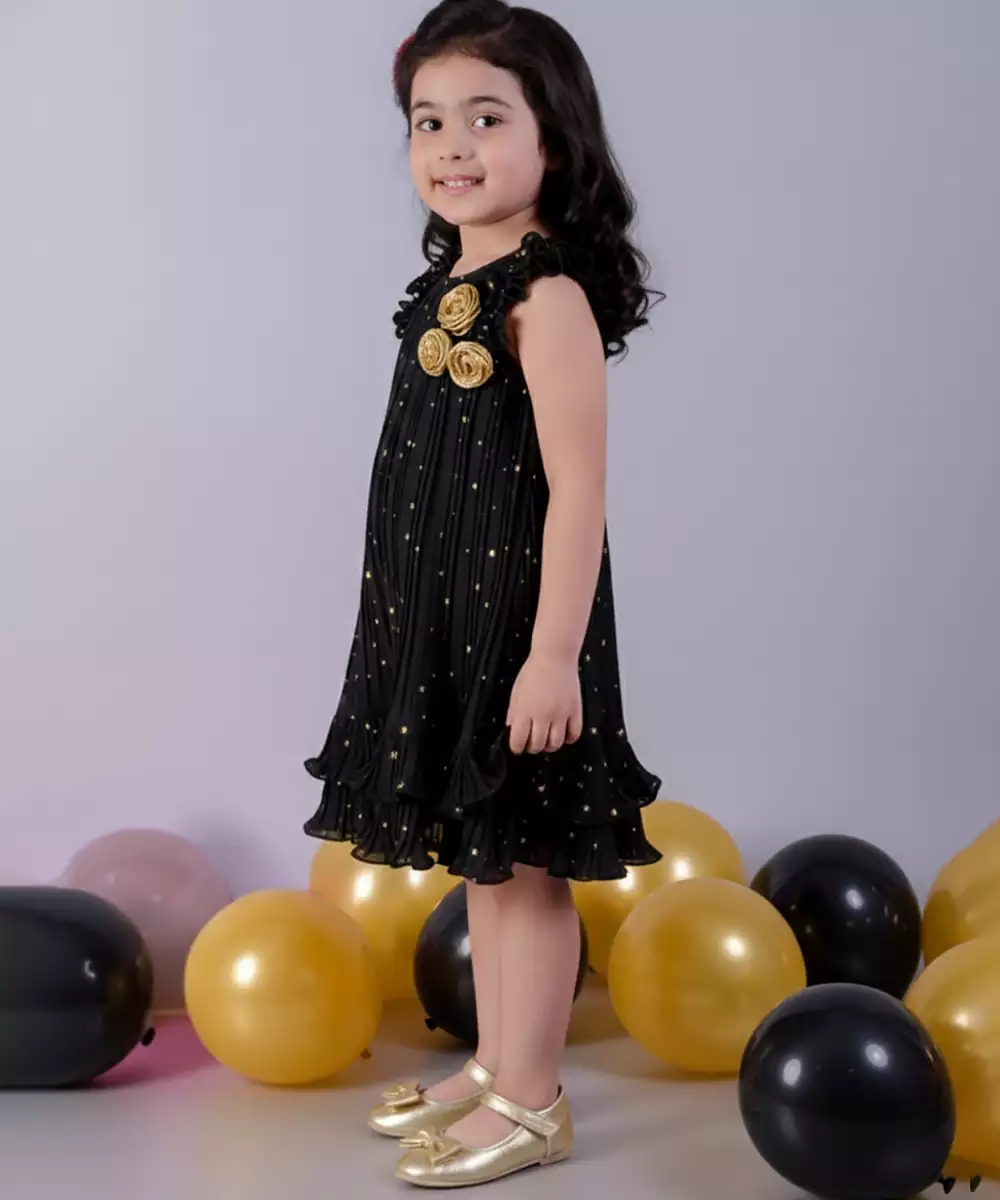 This Black Embroidered Polyester Dress Showcases Intricate Embroidery That Enhances Its Elegant Silhouette. The Lightweight Fabric Offers Comfort And Durability, Making It Suitable For Both Festive Occasions And Evening Gatherings. Its Timeless Black Tone Ensures Versatility And Easy Accessorizing.