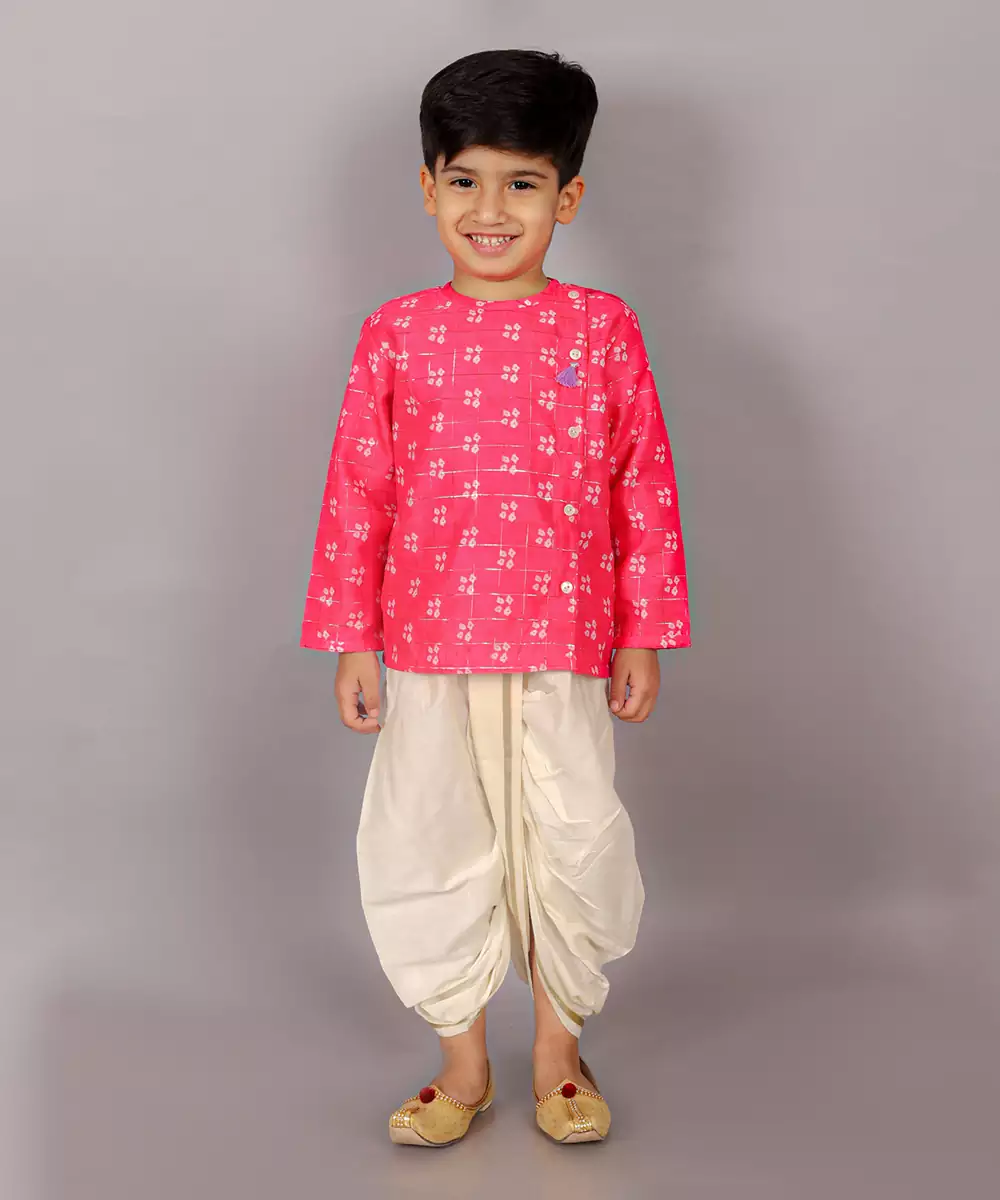 Bandhej Print Kurta Featuring Full Sleeves & Round Neckline Is Paired With A Dhoti. Color: Pink Fabric : Kurta Polyester Components: 2 (Kurta, Dhoti) Work: Bandhej Print