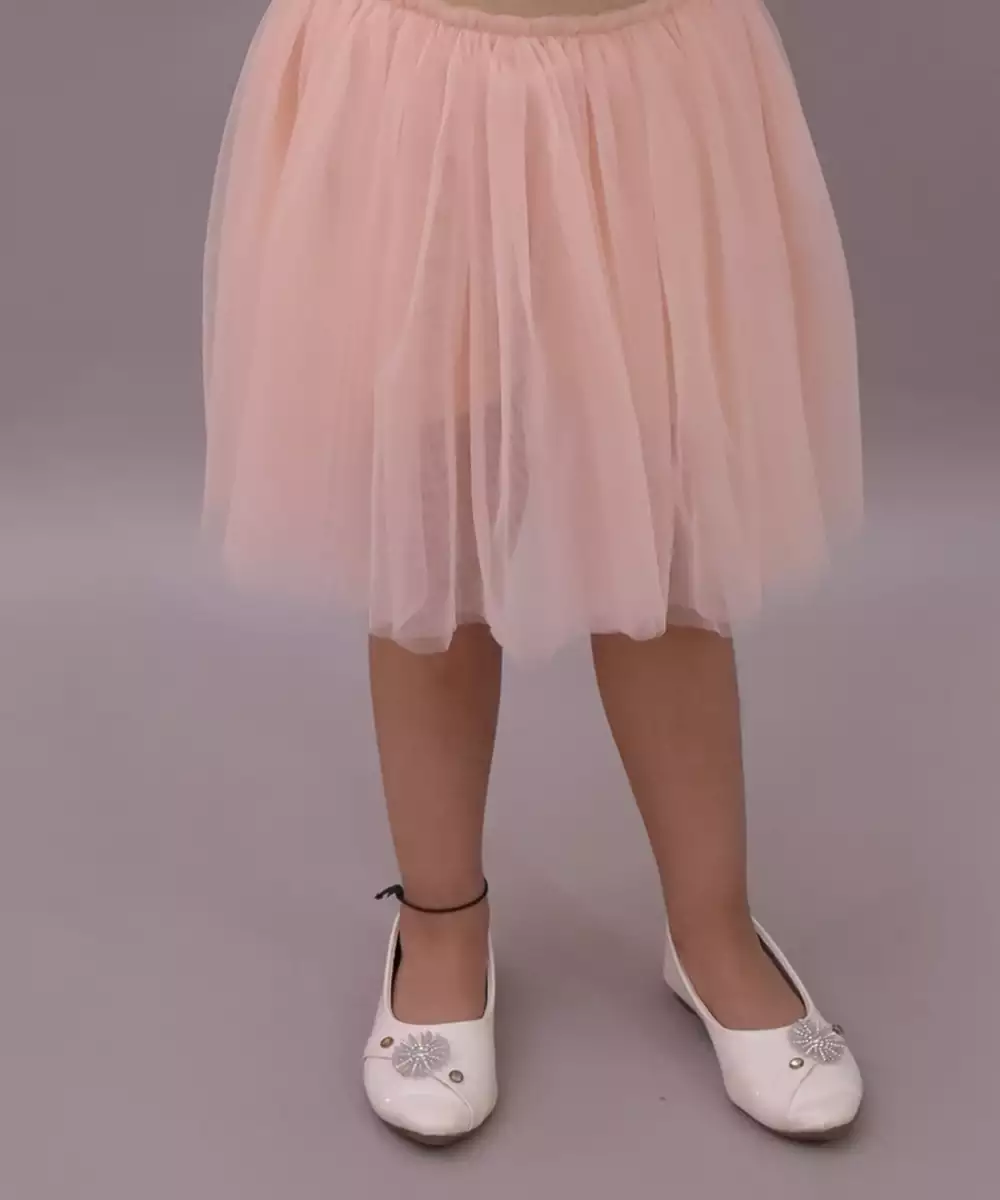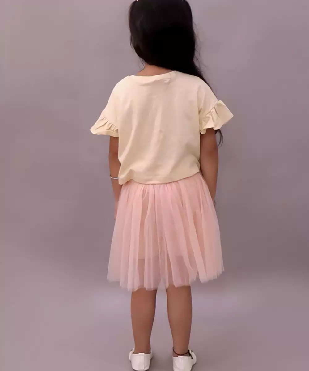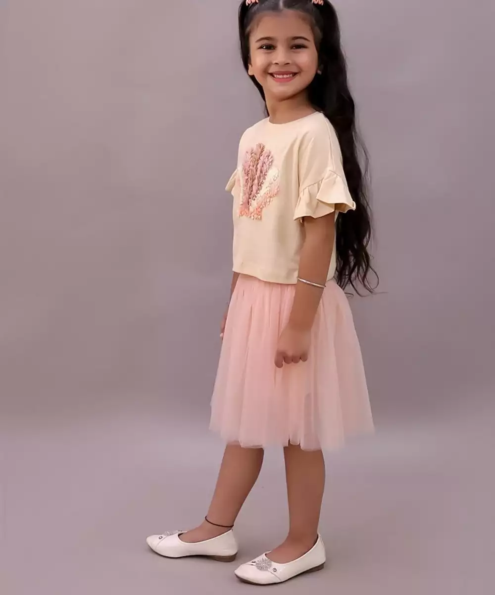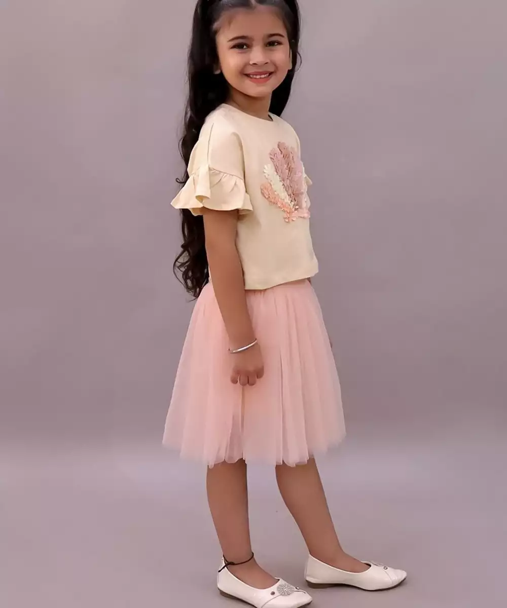 Lil Drama Cotton Half Sleeves 3 D Leaf Strips Tshirt With Net Skirt Set Off White And Peach Colour: Pink Fabric: Cotton Components: 1 Top / 1 Skirt