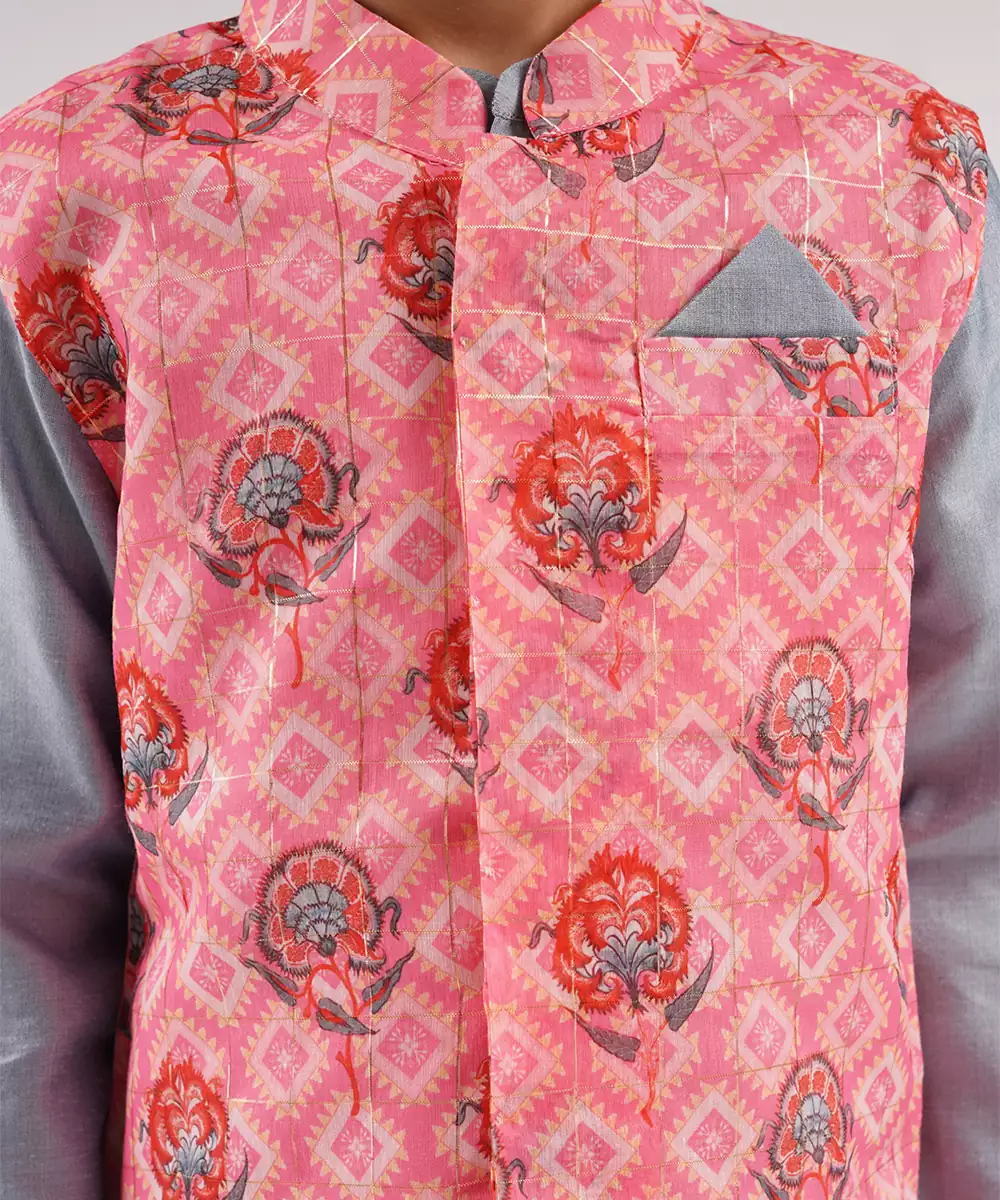 Digital Print Jacket With Minimal Chanderi Work Is Paired With A Full Sleeve Kurta Featuring Round Neckline And A Dhoti.