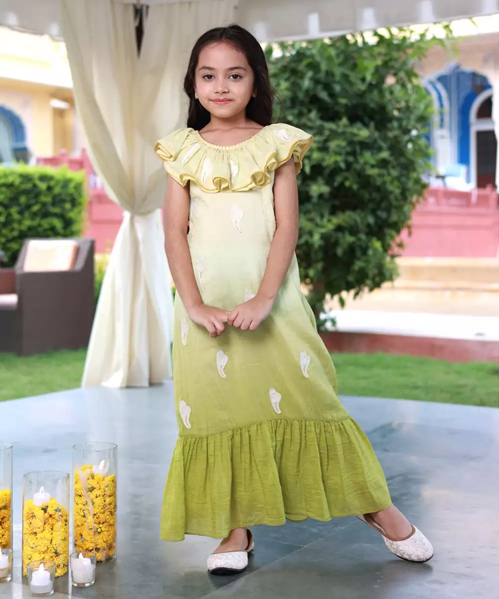 Green Ombre Maxi Dress Features A Hand Embroidered Flowers With Frills On The Neckline .